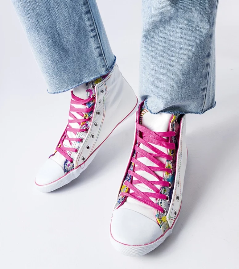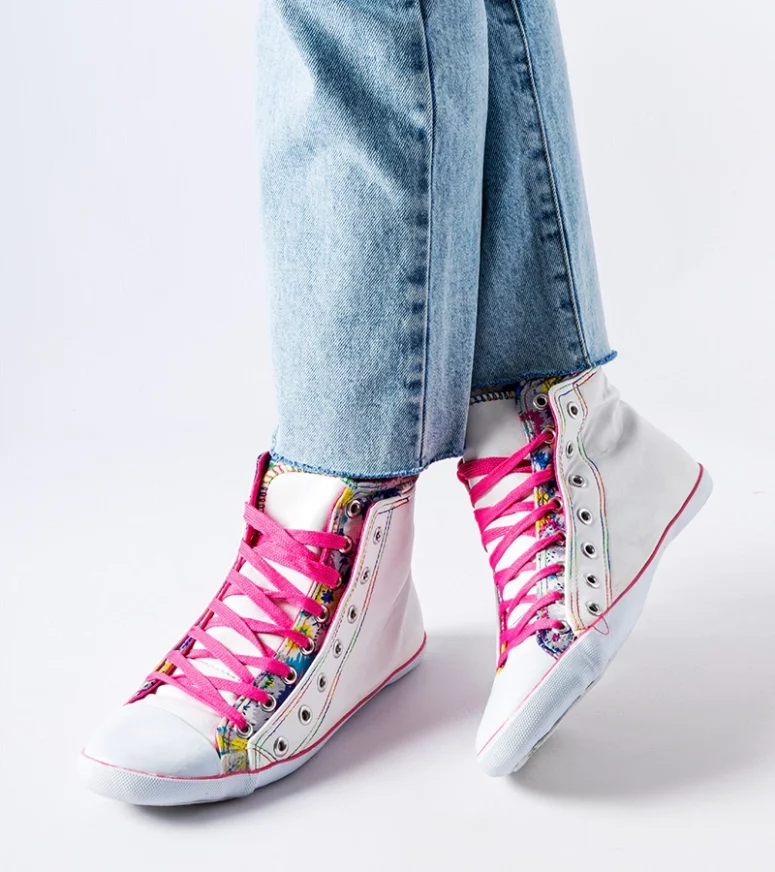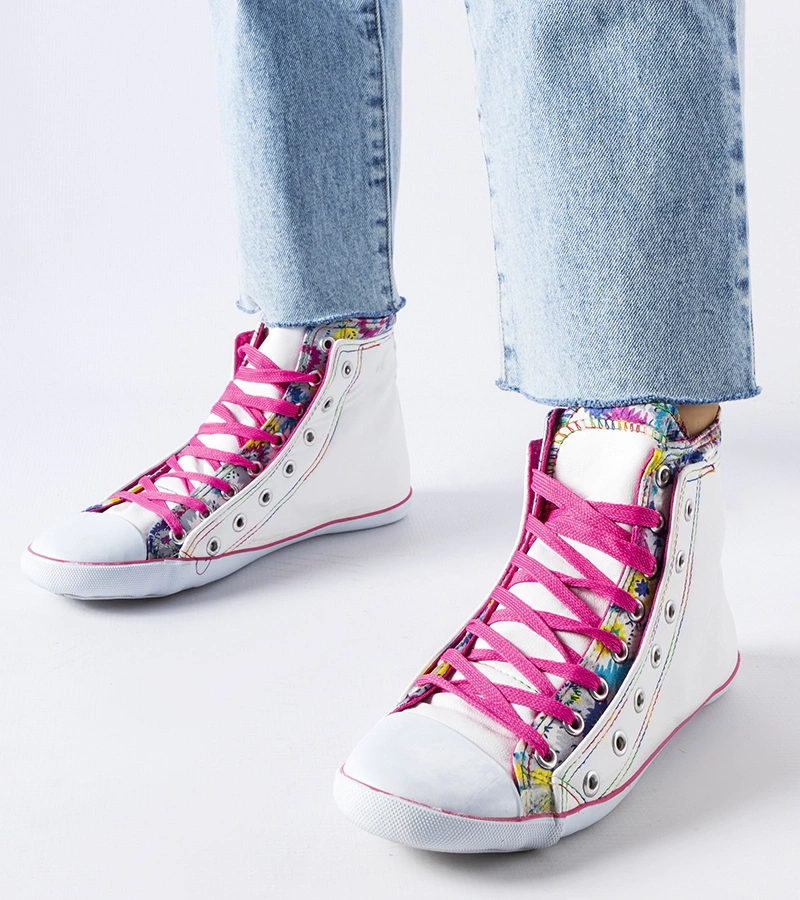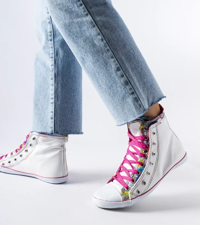 Białe trampki za kostkę w kwiaty Marphisa są idealne dla młodego pokolenia. Mają okrągły nosek i są zdobione wzorem kwiatowym, co nadaje im letni i trendy wygląd. Wykonane z gumy, zapewniają komfort noszenia na gorące dni. Trampki są płaskie, wysokie i sznurowane, co dodaje im popularności.