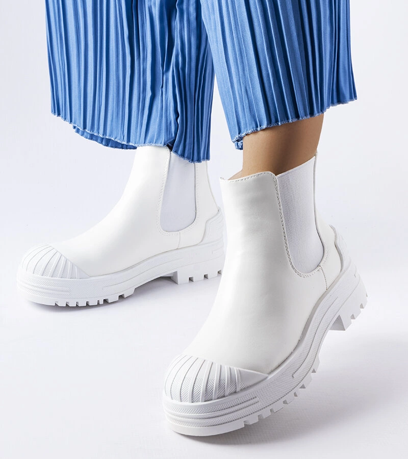 Białe workery z gumowymi wstawkami Lange to must-have dla młodego pokolenia. Mają wsuwane, okrągłe noski i są wysokie za kostkę. Są również dostępne w damskiej wersji. Ich płaski obcas oraz wykonanie z gumy zapewniają wygodę i komfort noszenia. Krój tych worków jest nowoczesny i modny.