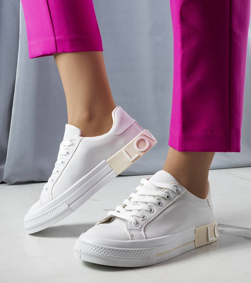 Biało-beżowe tenisówki zdobione napisem Nora