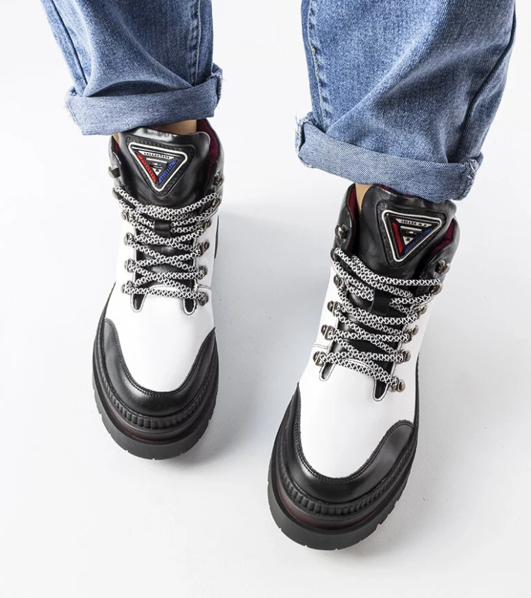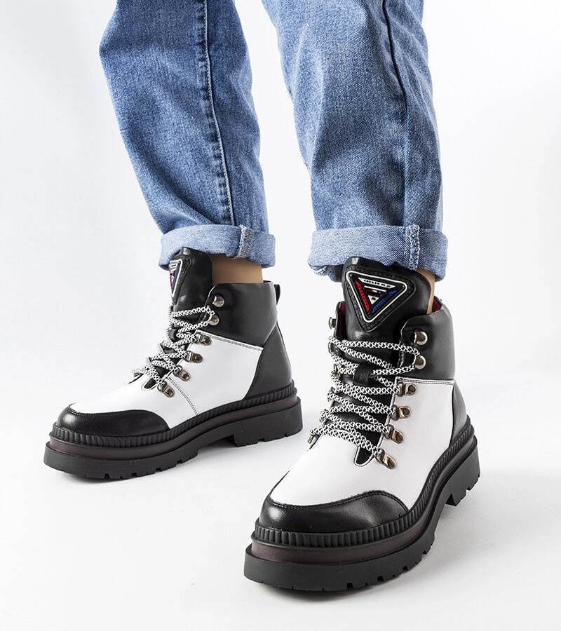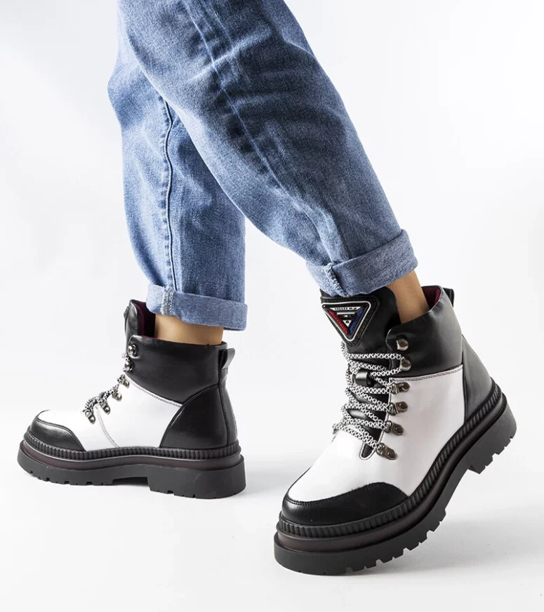 Słowa kluczowe: biało-czarne trapery, ocieplane trapery damskie, botki trapery Gemre, zimowe botki damskie, modne botki na jesień i zimę, biało-czarne ocieplane trapery Solofra.