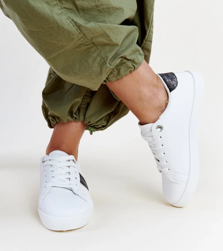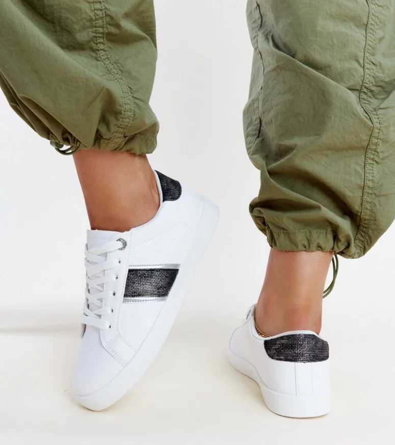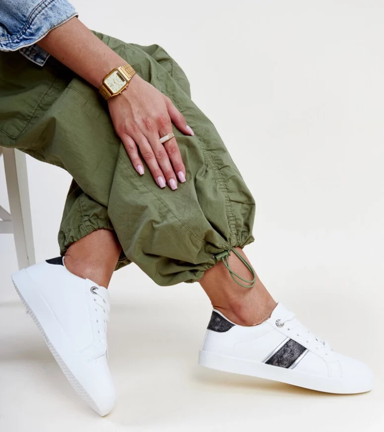 Białe i czarne sneakersy z ozdobnym paskiem Grada to doskonały wybór dla osób poszukujących eleganckiego i stylowego obuwia. Buty ozdobione są cyrkoniami, które dodają im szyku i klasy. Pomimo swojego luksusowego wyglądu, są one bardzo niedrogie, co sprawia, że stanowią idealną propozycję dla wszystkich, którzy chcą wyglądać modnie bez przepłacania. Niskie, sznurowane buty z gumową podeszwą zapewniają komfort noszenia przez cały dzień. Ich okrągły nosek oraz minimalistyczny design sprawiają, że są one nie tylko modne, ale również bardzo uniwersalne. To sztosowe obuwie, które z pewnością przypadnie do gustu każdej osobie, która ceni sobie ponadczasowy styl.