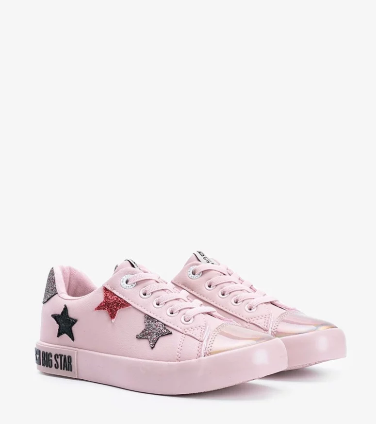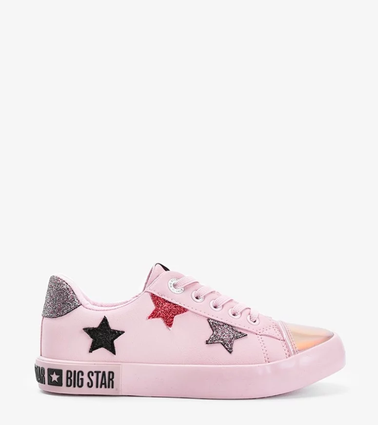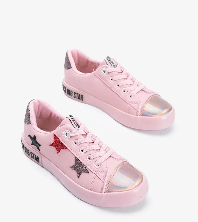 Dziecięce niskie sneakersy marki BIG STAR. Stylowe buciki zdobione są wieloma dodatkami. Głównym motywem butów są kolorowe gwiazdeczki oraz błyszczący nosek. Obuwie jest sznurowane i posiada grubą wygodną w użytkowaniu podeszwę. Wybieraj trampki BIG STAR z #Gemre!