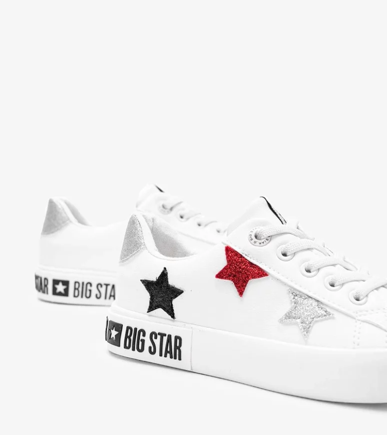 Dziecięce niskie sneakersy marki BIG STAR. Stylowe buciki zdobione są wieloma dodatkami. Głównym motywem butów są kolorowe gwiazdeczki oraz błyszczący nosek. Obuwie jest sznurowane i posiada grubą wygodną w użytkowaniu podeszwę. Wybieraj trampki BIG STAR z #Gemre!