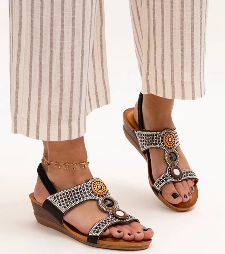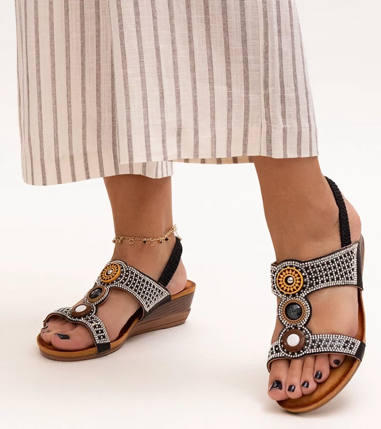 Błyszczące sandały na niskiej koturnie Azeeza to idealny wybór dla letniej fasionistki! Te wyjątkowe buty ozdobione są pięknymi cyrkoniami, które dodają im blasku i elegancji. Dzięki swojej niskiej koturnie są nie tylko modne, ale także bardzo wygodne do noszenia przez cały dzień. Dodatkowym atutem jest fakt, że są wsuwane, co sprawia, że łatwo je założyć i zdejmować. Te niedrogie sandały będą doskonałym uzupełnieniem letniej garderoby, zwłaszcza w gorące dni.