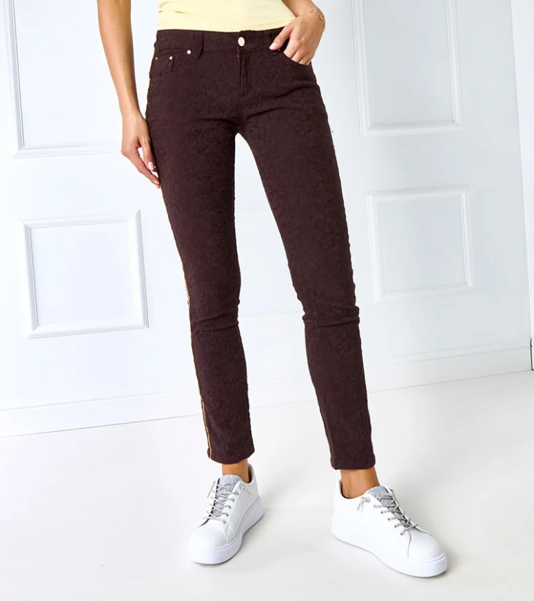 Uniwersalny brązowy kolor w połączeniu z oryginalnym printem sprawia, że brązowe wzorzyste spodnie z niskim stanem Lamel łatwo dopasujesz do innych elementów garderoby. Świetnie komponują się zarówno z jasnymi, jak i ciemnymi barwami – beżem, bielą, czernią czy odcieniami ziemi. Jeśli szukasz produktu, który pozwoli Ci podkreślić własny styl, te wzorzyste spodnie damskie są idealnym wyborem.