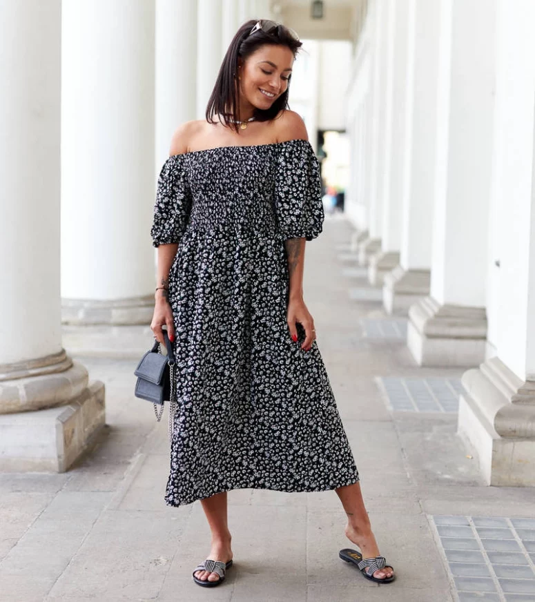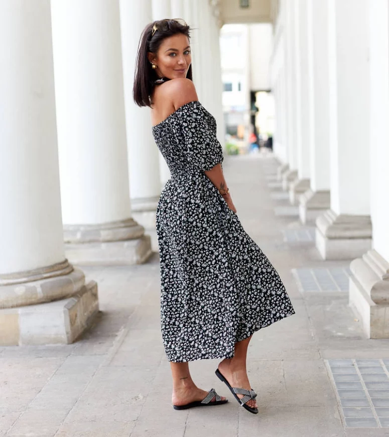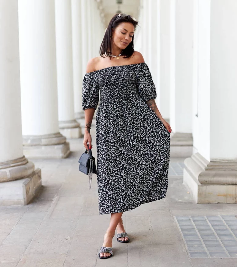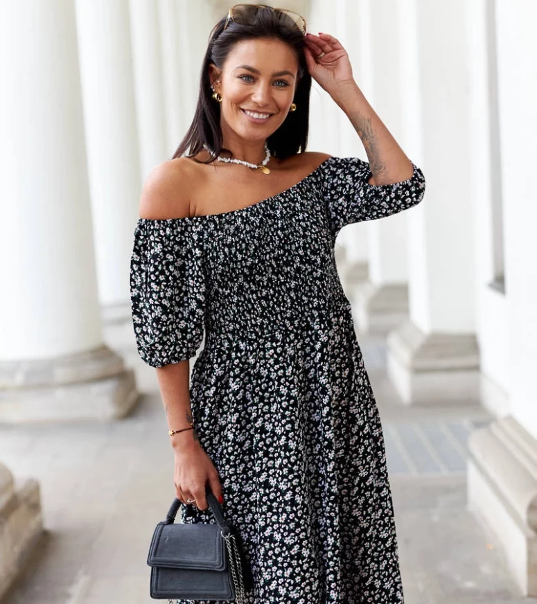 Wykonana z wysokiej jakości materiałów, czarna sukienka midi zapewnia komfort noszenia przez cały dzień. Jej subtelny, kwiatowy wzór dodaje lekkości i delikatności, podkreślając kobiecość każdej sylwetki. Sukienka posiada klasyczny krój, który doskonale dopasowuje się do ciała, podkreślając atuty figury.