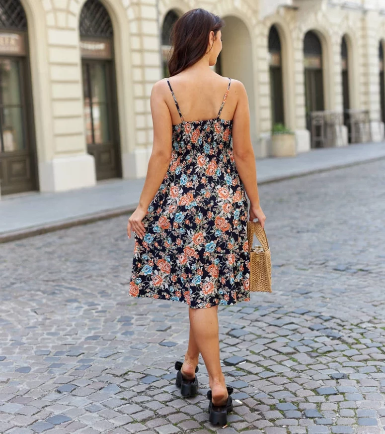 Sukienka posiada regulowane ramiączka, co pozwala na idealne dopasowanie do sylwetki, podkreślając jej atuty. Delikatny dekolt i luźny krój zapewniają swobodę ruchów i komfort noszenia przez cały dzień. Czarna sukienka w połączeniu z kolorowymi kwiatami to doskonały wybór na wiosnę i lato, ale również na jesienne dni w zestawieniu z ciepłym kardiganem czy elegancką marynarką.