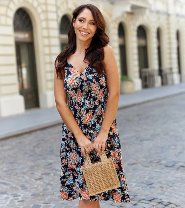 Nasza czarna sukienka na ramiączkach charakteryzuje się subtelnym wzorem w kolorowe kwiaty, który dodaje jej lekkości i romantycznego uroku. Dzięki uniwersalnemu fasonowi doskonale sprawdzi się zarówno na co dzień, jak i na specjalne okazje, takie jak wesela, przyjęcia czy romantyczne kolacje. Sukienka w kwiaty to must-have w garderobie każdej kobiety, która ceni sobie elegancję i niebanalny styl.