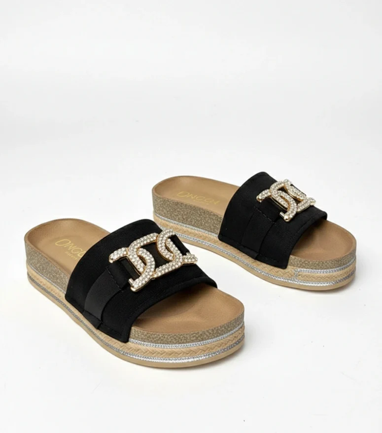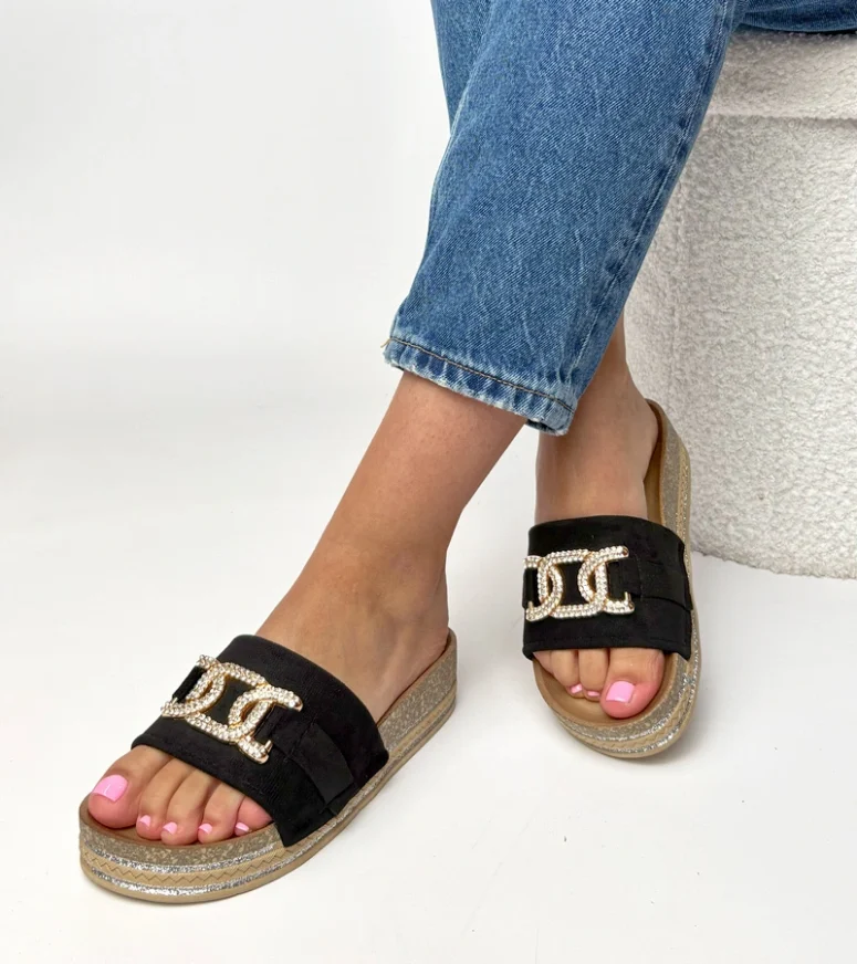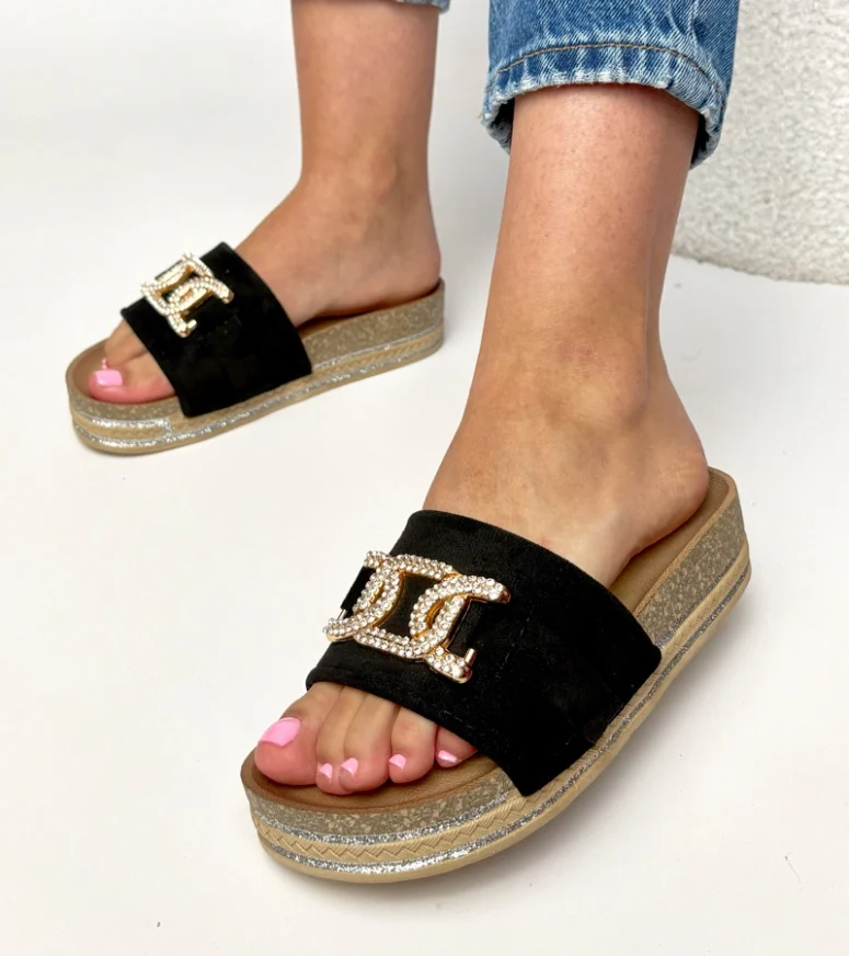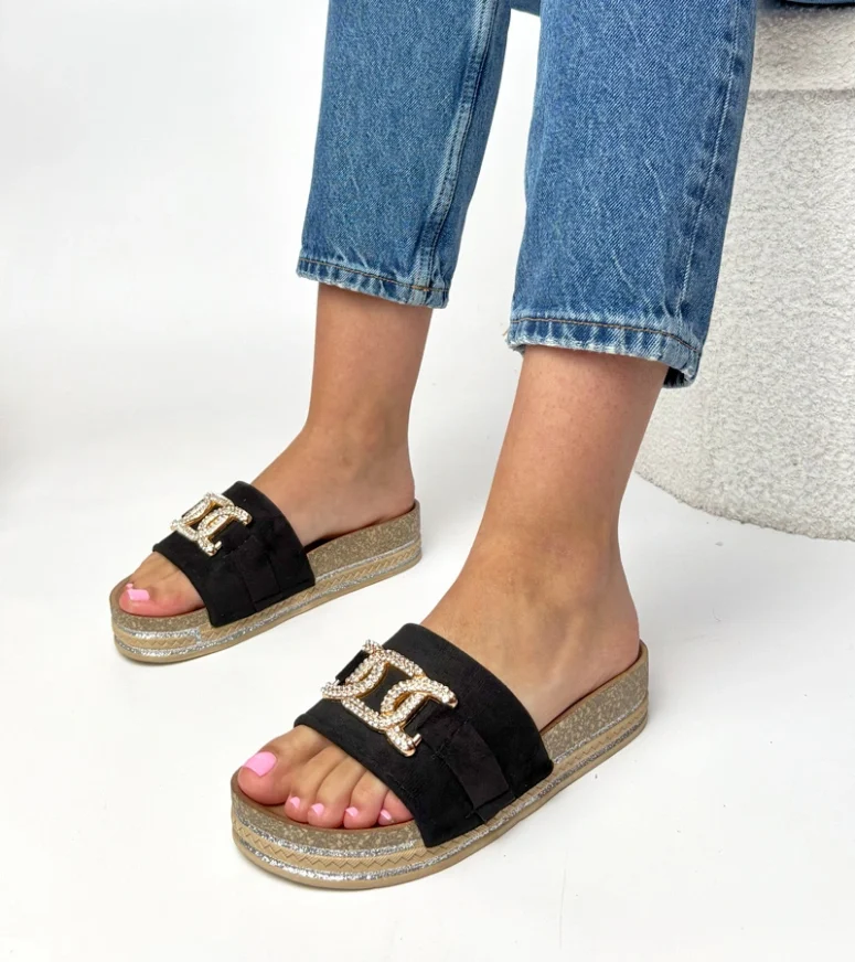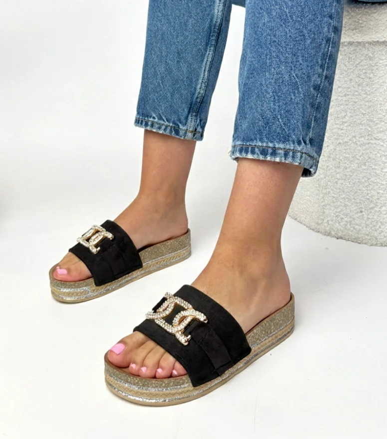 Czarne klapki na platformie z błyszczącymi ozdobami Faustine