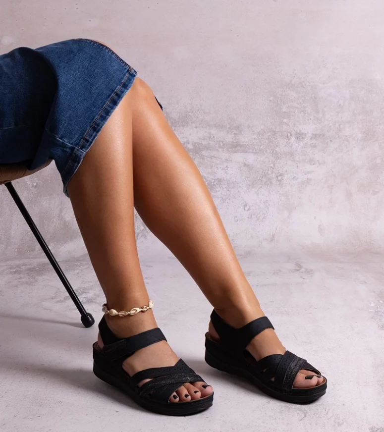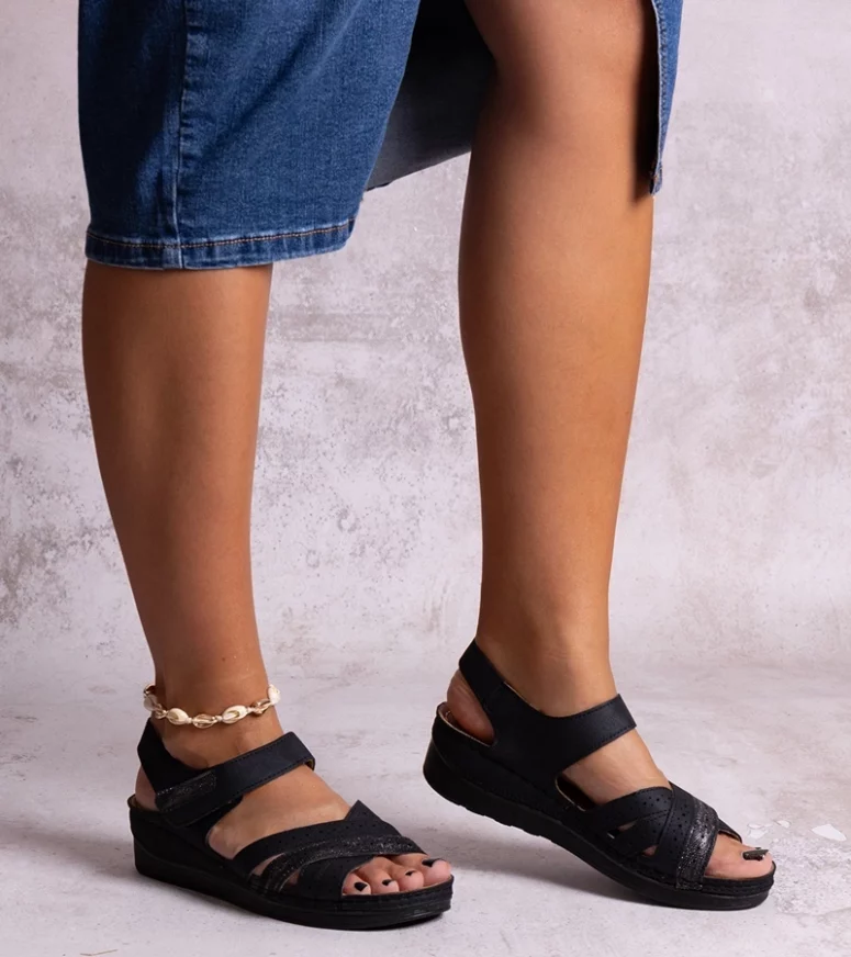Czarne sandały na niskiej koturnie Areja to klasyczny wybór, który idealnie wpisuje się w obecne trendy. Wykonane z elastycznej gumy, zapewniają komfort noszenia nawet podczas gorących letnich dni. Ich platforma na średnim obcasie dodaje im innowacyjnego charakteru, a metaliczne detale sprawiają, że są niezwykle chic. To doskonała propozycja dla kobiet ceniących sobie wygodę i styl!