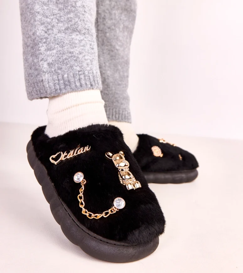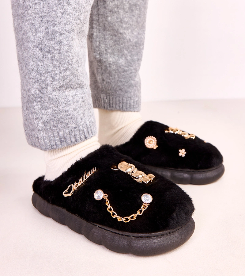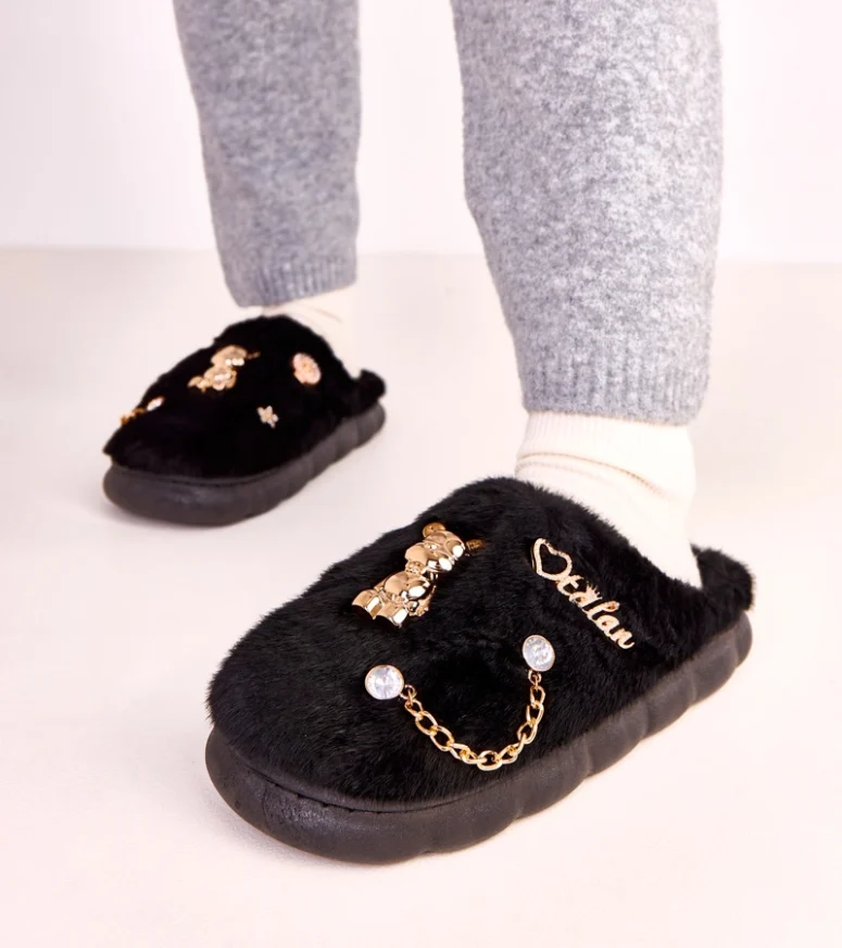 Czarne zabudowane kapcie z ozdobami Tracy zostały wykonane z miękkich, przyjemnych w dotyku materiałów, które delikatnie otulają stopę i minimalizują ryzyko otarć. Wnętrze kapcia sprzyja cyrkulacji powietrza, co podnosi komfort użytkowania nawet przy dłuższym noszeniu. Stabilna, dobrze wyprofilowana podeszwa zwiększa wygodę chodzenia oraz zapewnia odpowiednią przyczepność do podłoża. To idealne kapcie do domu dla osób poszukujących połączenia wygody i estetycznego wyglądu.
