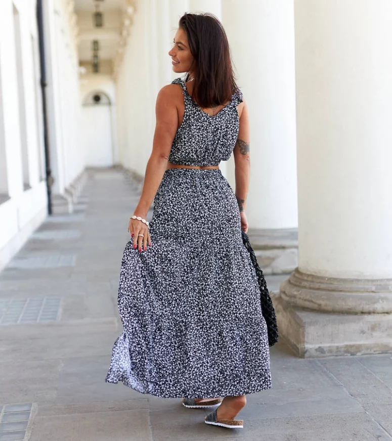 Top i spódnica wyróżniają się oryginalnym designem, który idealnie wpisuje się w modowe trendy. Zdobione wzorem kwiatowym, dodają elegancji i uroku całemu zestawowi. To doskonała propozycja dla kobiet ceniących sobie damskie i subtelne akcenty.