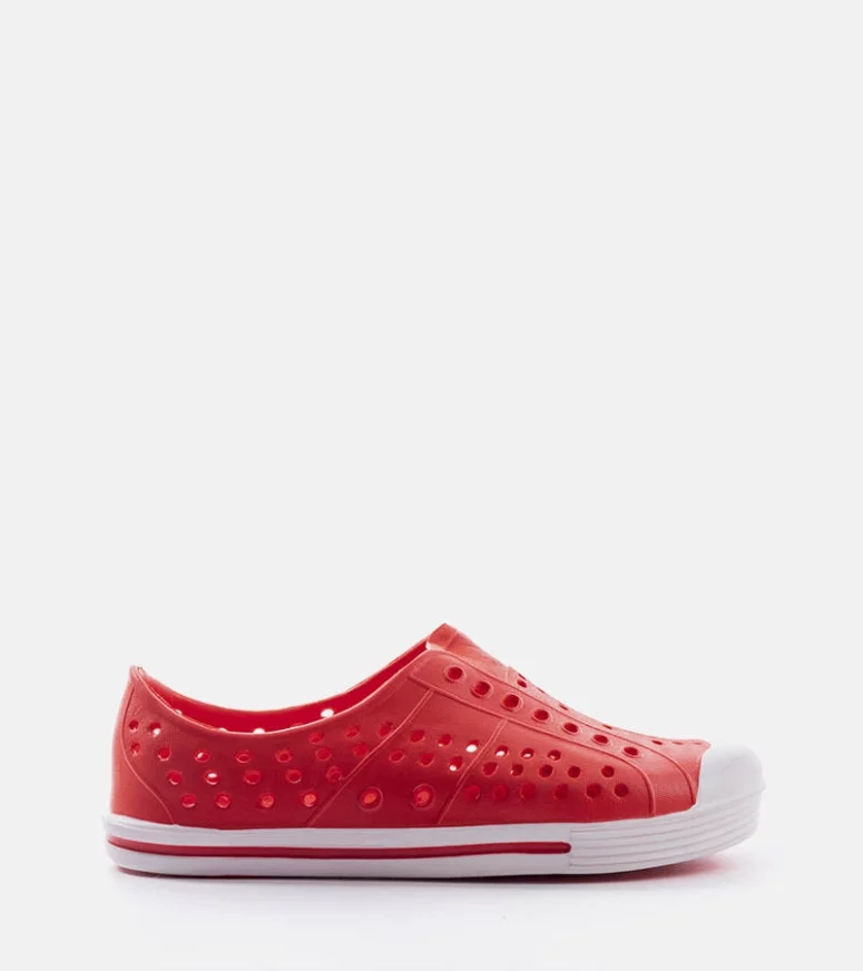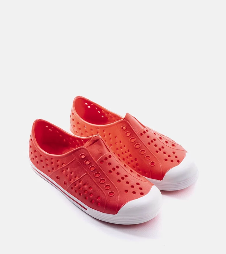 Klapki basenowe dla dzieci Peppin. Zachwycają wygodą użytkowania, ponieważ zostały wykonane z lekkiego i elastycznego tworzywa gumowego. Oprócz tego, łatwemu wsuwaniu, mogą posłużyć jako klasyczne klapki lub jako sandały, tak, by zapewnić dziecku jak największy komfort. Ich dziurkowanie sprawia, że woda nie zatrzymuje się w butach. Idealnie sprawdzą się zarówno na basen, jak i na plażę lub nad jezioro. Wszelkie zabrudzenia możesz łatwo usuwać za pomocą wilgotnej szmatki. Numeracja niestandardowa, prosimy kierować się tabelą rozmiarów.