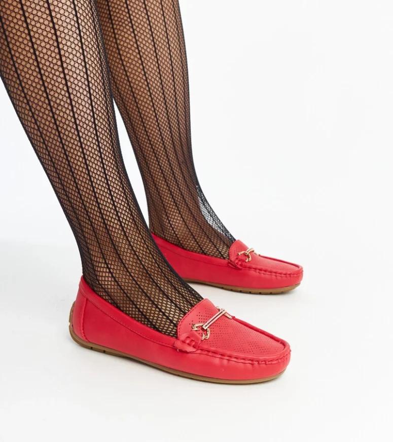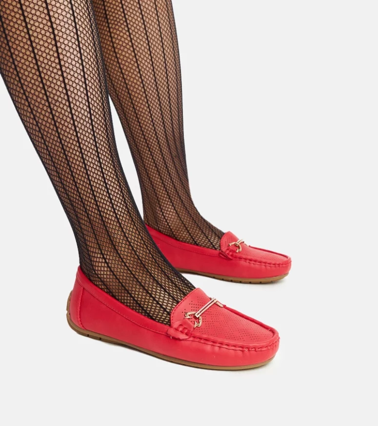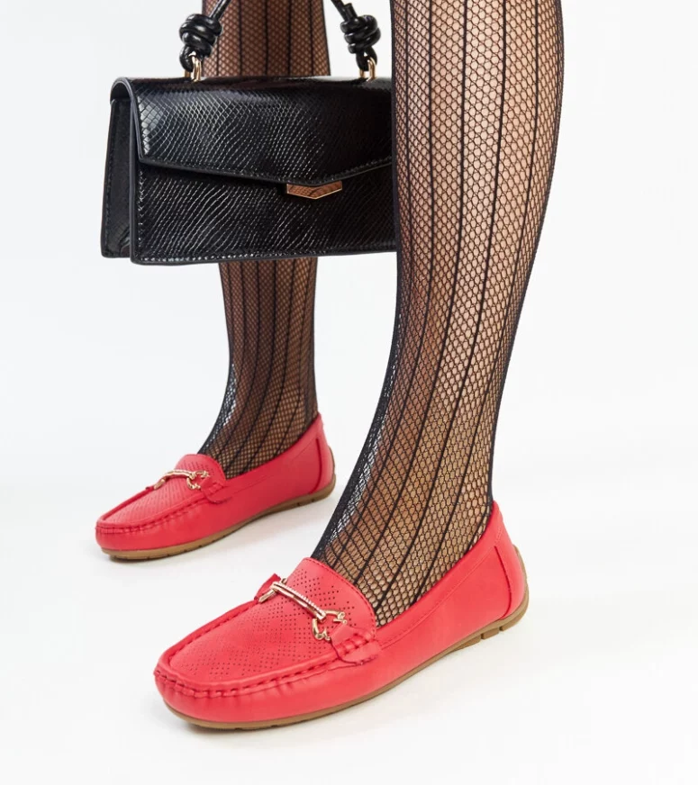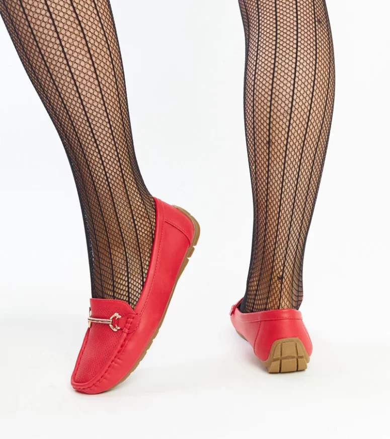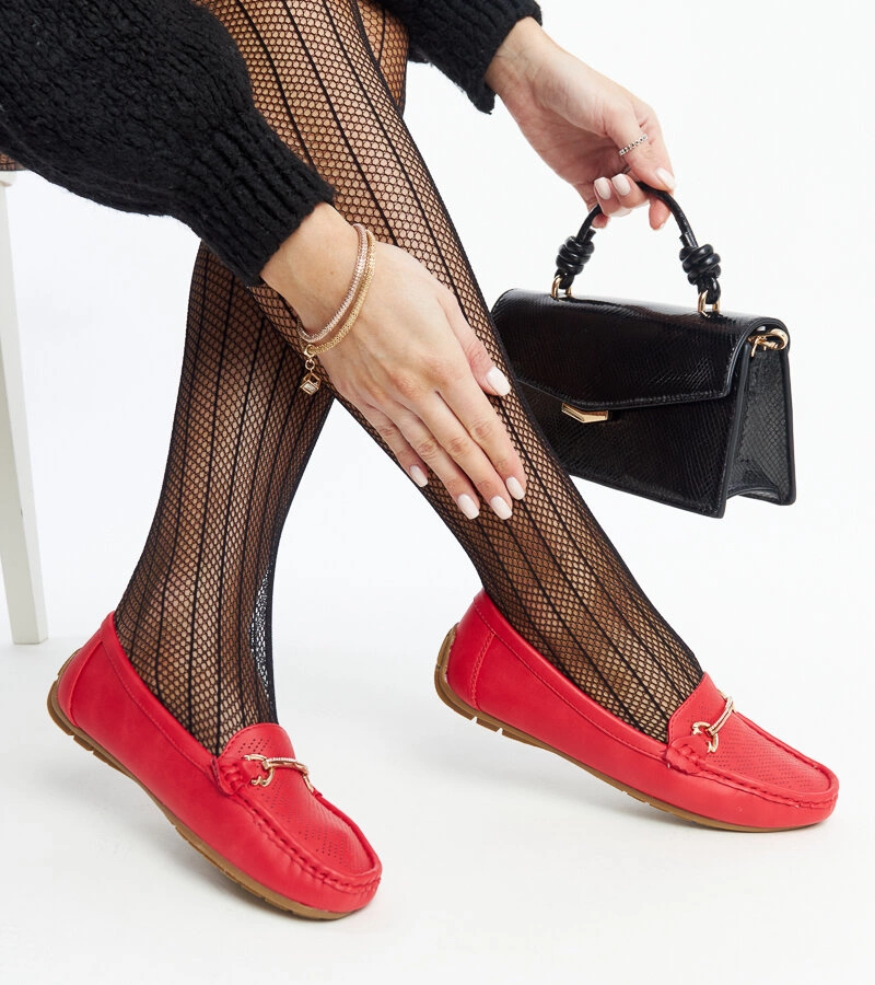 Czerwone mokasyny z ozdobną klamerką Adila to popularny i na czasie model obuwia. Mają niski, płaski obcas oraz są ozdobione cyrkoniami, co dodaje im elegancji. Wykonane są z wysokiej jakości gumy, co gwarantuje wygodę noszenia. Dodatkowo są wsuwane, dzięki czemu łatwo je założyć i zdejąć. Ten tanie model posiada migdałkowy nosek, który dodaje im subtelnego uroku. Idealne na co dzień!