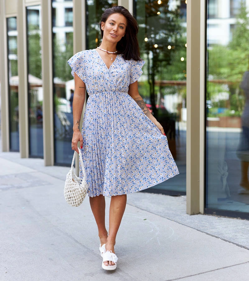 Nie czekaj, aż inni będą mieli tę wyjątkową plisowaną sukienkę. Dodaj ją do swojej garderoby i poczuj się wyjątkowo na każdej okazji. Niebieska sukienka w kwiaty Viminale to must-have tego sezonu, który podkreśli Twoją kobiecość i doda pewności siebie.