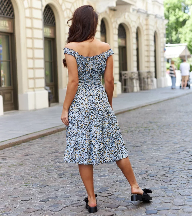 Sukienka ma prosty, ale jednocześnie oryginalny fason. Ramiączka dodają jej lekkości i delikatności, podkreślając ramiona i dekolt. Długość sukienki sięga do kolan, co nadaje jej elegancji i klasy.