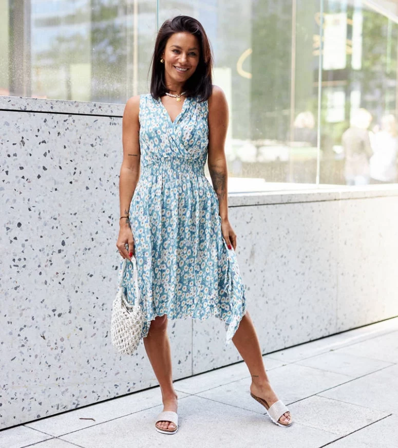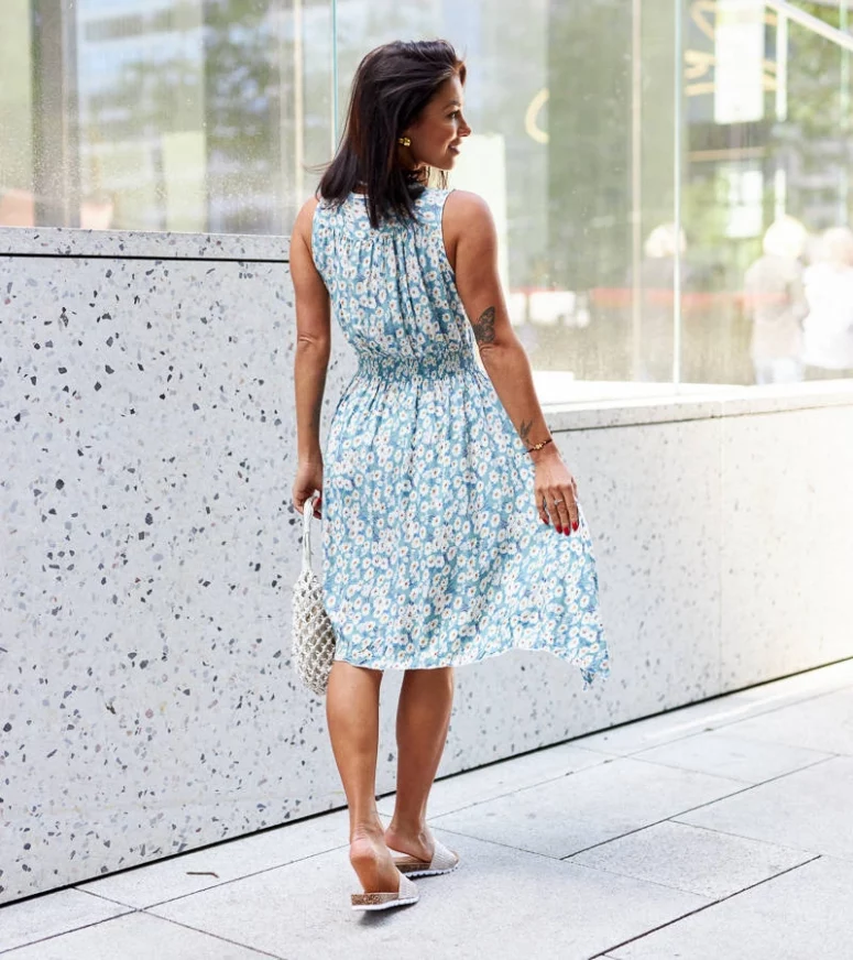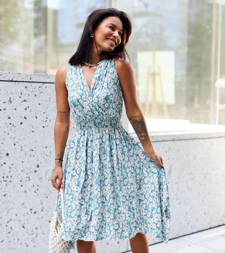 Wykonana z wysokiej jakości materiałów, nasza niebieska sukienka zapewnia komfort noszenia przez cały dzień. Kwiatowy wzór dodaje jej romantycznego charakteru, idealnego na letnie spacery, spotkania z przyjaciółmi czy rodzinne uroczystości. Jej uniwersalny krój sprawia, że pasuje do różnych sylwetek, a subtelne detale dodają jej elegancji.