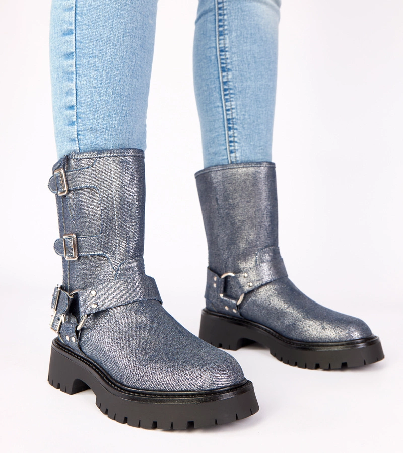 Słowa kluczowe: niebieskie botki, botki ze sprzączkami, botki ze srebrnym połyskiem, botki damskie, stylowe botki, botki Cara, botki na co dzień, modne botki, botki jesienne, botki na sezon przejściowy.