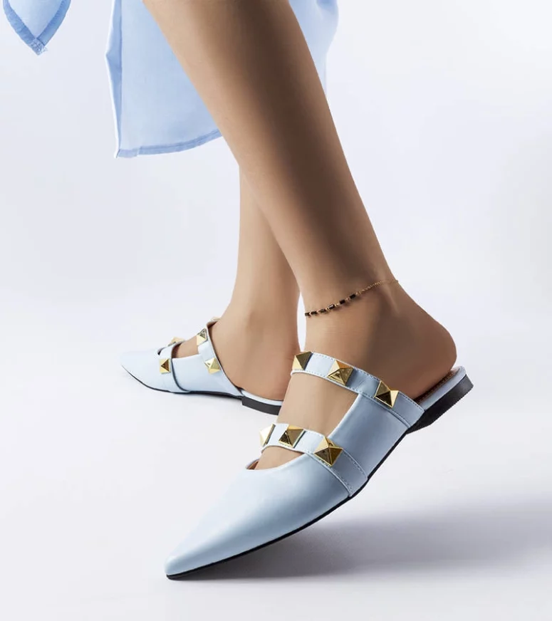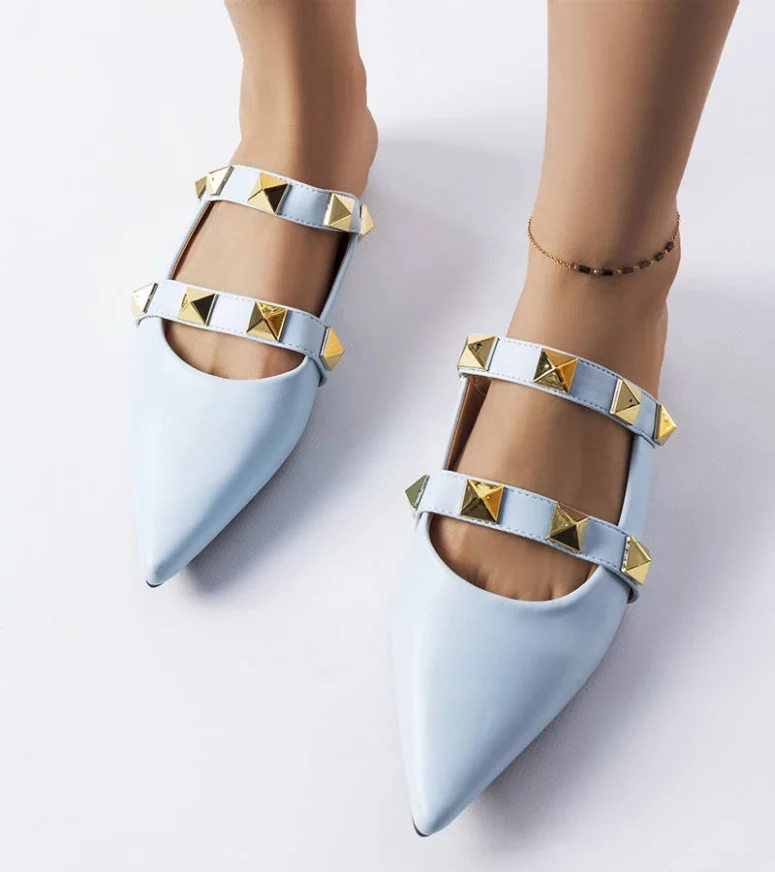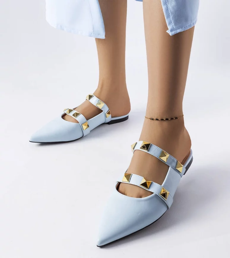 Klapki Ruckman ze szpiczastym noskiem, wsuwane. Zabudowane z przodu oraz po bokach, wycięte na pięcie i śródstopiu. Osadzone na płaskim obcasie. Ozdobione dwoma paskami z ćwiekami. Wykonane ze skóry ekologicznej. Najlepiej leżą na wąskiej stopie. Lubisz nosić nowoczesne, niespotykane buty i dodatki? Koniecznie zaopatrz się w te klapki! Numeracja standardowa, sugerujemy kierować się swoim rozmiarem.