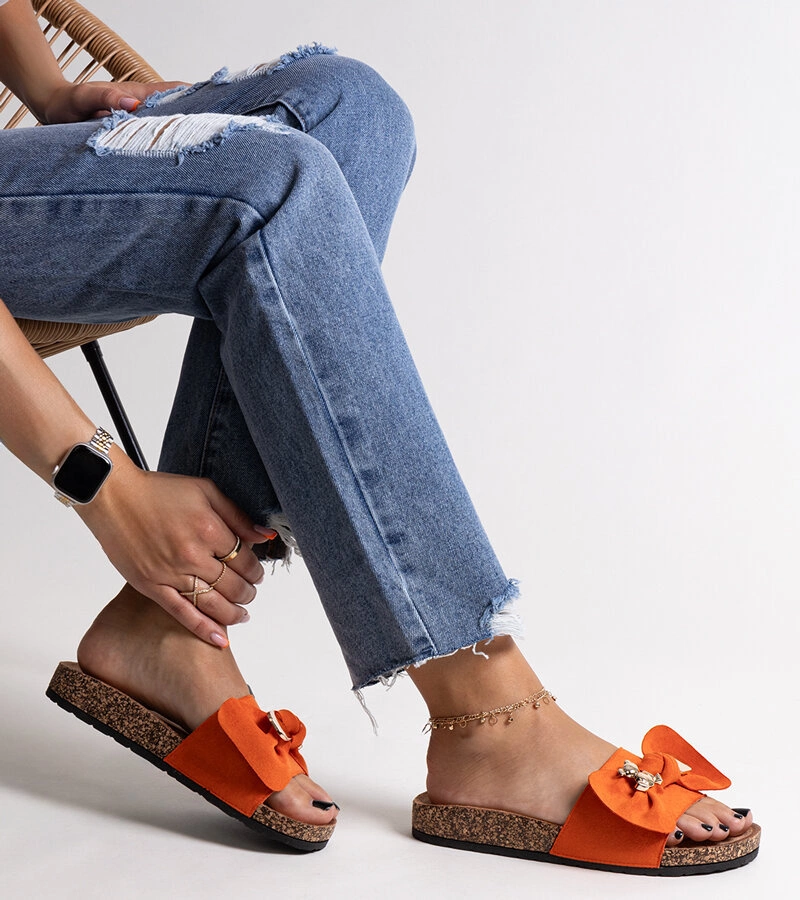 Pomarańczowe klapki z kokardą i z misiem Segan