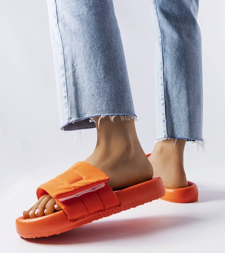 Klapki Aleron na platformie, z delikatnym bieżnikiem. Nosek odkryty, o zaokrąglonym kształcie. Wygodnie wsuwane. Stopę oplata szeroki pasek, z przodu zapinany na rzep. Klapki wykonane z materiału tekstylnego, z wkładką z ekoskóry. Znakomite na co dzień, basen lub plażę! Numeracja standardowa, prosimy sugerować się swoim rozmiarem.