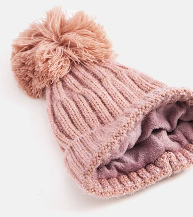 Model Karloti to model idealny dla kobiet które nie lubią zimna. Wnętrze jest wykończone ciepłym i przyjemnym w dotyku materiałem. Prążkowany wzór z błyszczącą nicią i puchaty pompon tworzą duet idealny. Materiał jest rozciągliwy.