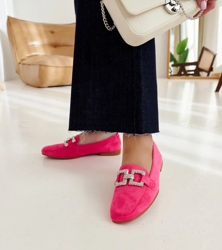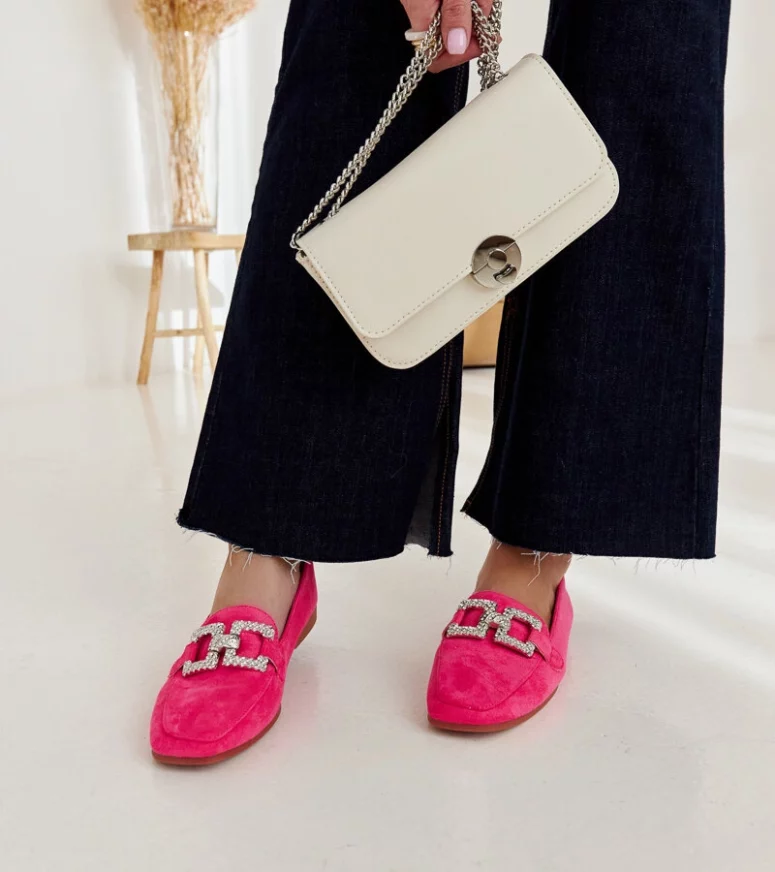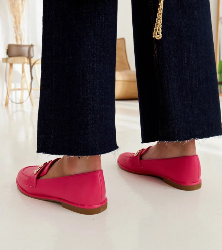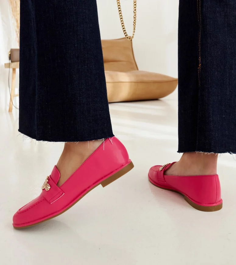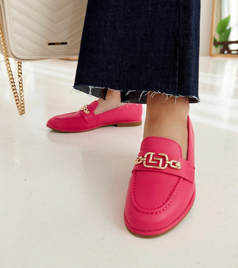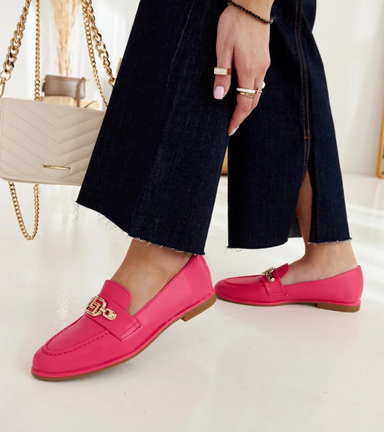 Różowe mokasyny Kuens to idealny wybór na letnie dni. Ich nowoczesny design z migdałkowym nosem i wsuwanej konstrukcji sprawia, że są nie tylko eleganckie, ale także bardzo wygodne. Ozdobione łańcuszkiem dodają im szczypty chic, co czyni je doskonałym uzupełnieniem letnich stylizacji. Niskie, wykonane z gumy – te mokasyny będą idealne na gorące dni!