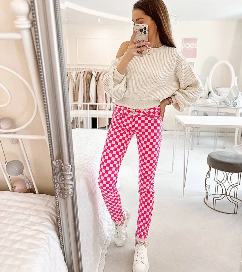 Spodnie Bler ze zwężaną nogawką. High waist ze szlufkami. Zapinane na suwak i guzik. Wsuwanie kieszenie na wysokości bioder. Pokryte modnym wzorem w szachownicę. Modne spodnie w kratę, które wystylizujesz na wiele sposobów! Pasują zarówno do marynarki, kurtki jeansowej, jaki ramoneski. Podczas wyboru prosimy sugerować się tabelą rozmiarów.