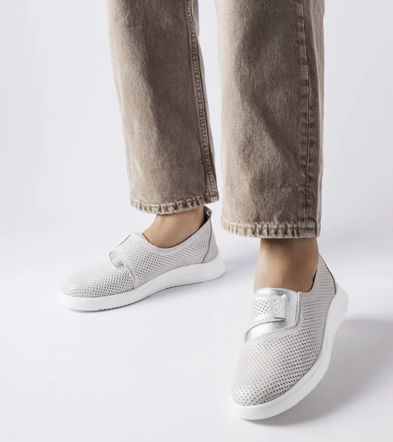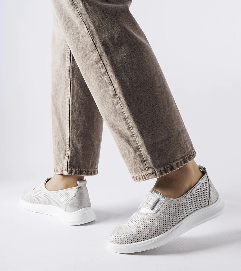 Srebne skórzane tenisówki perforowane Ethels to idealny wybór na gorące dni dla młodego pokolenia. Te damskie letnie buty są niskie, posiadają okrągły nosek i ażurowe wzory, które zapewniają doskonałą wentylację podczas ciepłych dni. Dodatkowo, są one wsuwane, co sprawia, że są bardzo wygodne i łatwe do założenia. Wykonane z wysokiej jakości skóry, te tenisówki są trwałe i wyjątkowe. Posiadają elastyczną gumową podeszwę, która zapewnia doskonałą przyczepność na różnych powierzchniach. To nie tylko modne, ale także tanie obuwie, które doda stylu każdej letniej stylizacji.