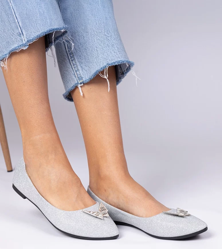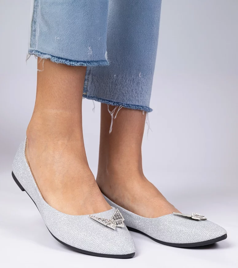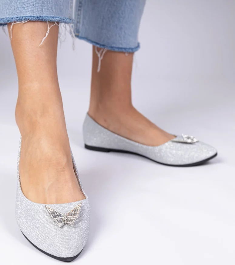 Srebrne Damskie Balerinki Brokatowe z Motylkiem Denny – Gemre