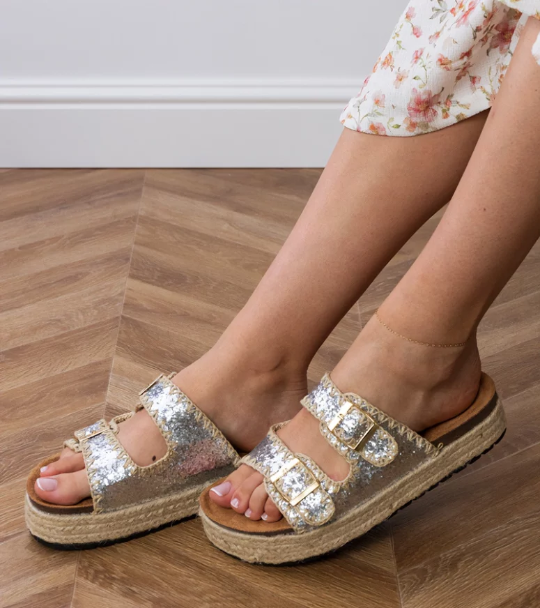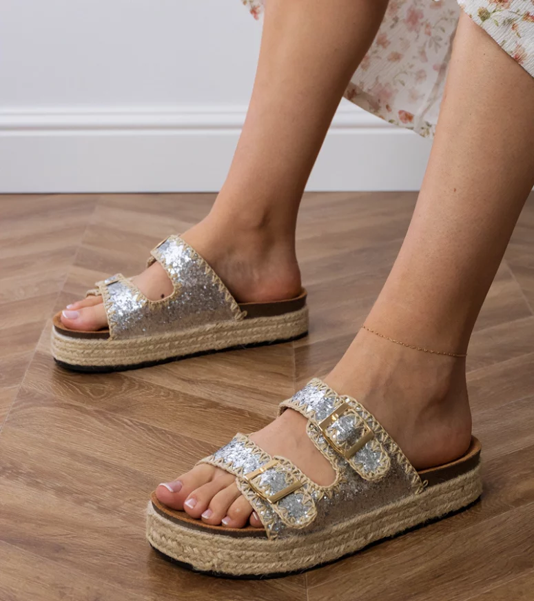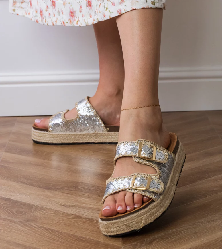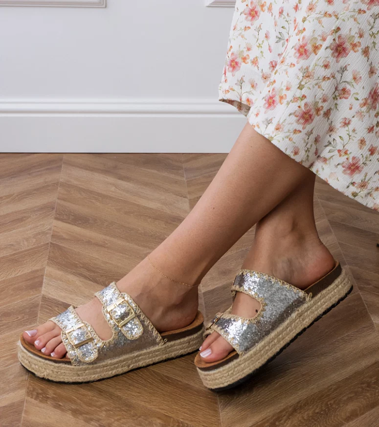 Srebrne klapki espadryle to propozycja dla osób lubiących ponadczasowe fasony w nowoczesnym wydaniu. Charakterystyczna, pleciona podeszwa w stylu espadryli znakomicie współgra z połyskującą cholewką, tworząc ciekawy kontrast. Brokatowe klapki z klamerkami są lekkie, przewiewne i łatwe do zakładania, dzięki czemu stanowią wygodne rozwiązanie na wakacyjne wyjazdy, spacery po mieście czy letnie spotkania ze znajomymi. Regulowane klamerki umożliwiają dopasowanie szerokości do stopy, zwiększając komfort użytkowania.