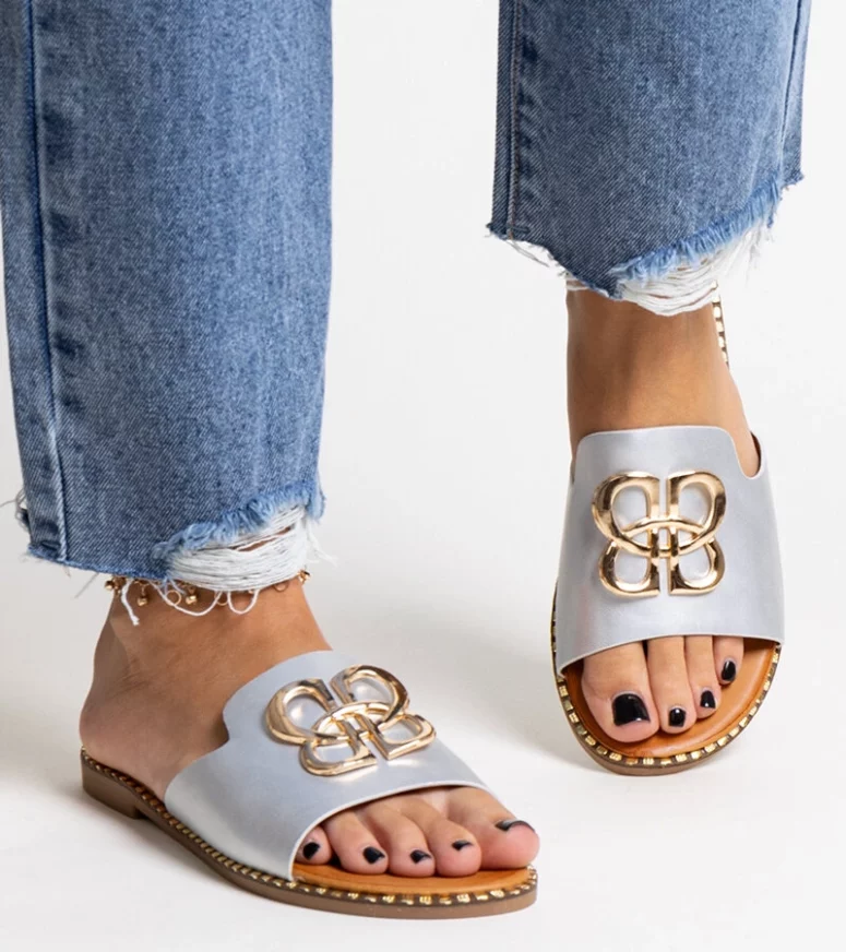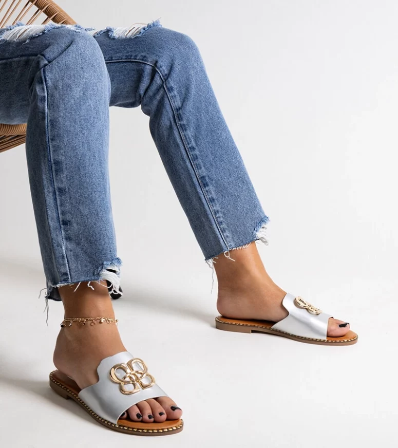Srebrne klapki z ozdobną klamerką Safi to idealny wybór na gorące dni! Wykonane z wysokiej jakości gumy, są nie tylko wygodne, ale także bardzo eleganckie. Dzięki wsuwanej konstrukcji są łatwe do założenia i zdejmowania. Ich płaski obcas sprawia, że są doskonałe na letnie spacery czy wieczorne spotkania. Srebrny kolor dodaje im szyku i sprawia, że są popularnym wyborem wśród wielu osób. Postaw na wygodę i styl z klapkami Safi!