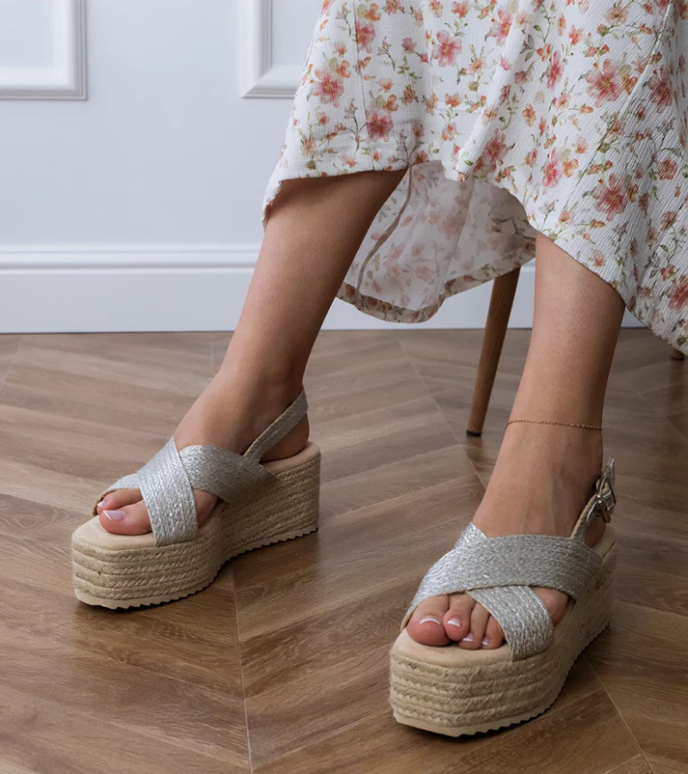 Klasyczne espadryle na platformie zostały wzbogacone o efektowne paski, które stabilnie trzymają stopę i subtelnie ją eksponują. Srebrne wykończenie w połączeniu z charakterystyczną plecionką sprawia, że te sandały na platformie wpisują się w najnowsze trendy mody. Idealnie komponują się z sukienkami, spódnicami, szortami czy lekkimi spodniami, dlatego sprawdzą się podczas wakacyjnych wyjazdów, spacerów po mieście oraz letnich spotkań ze znajomymi.