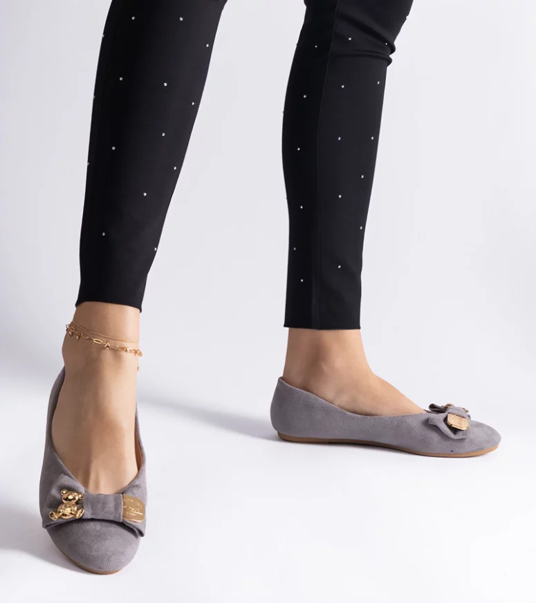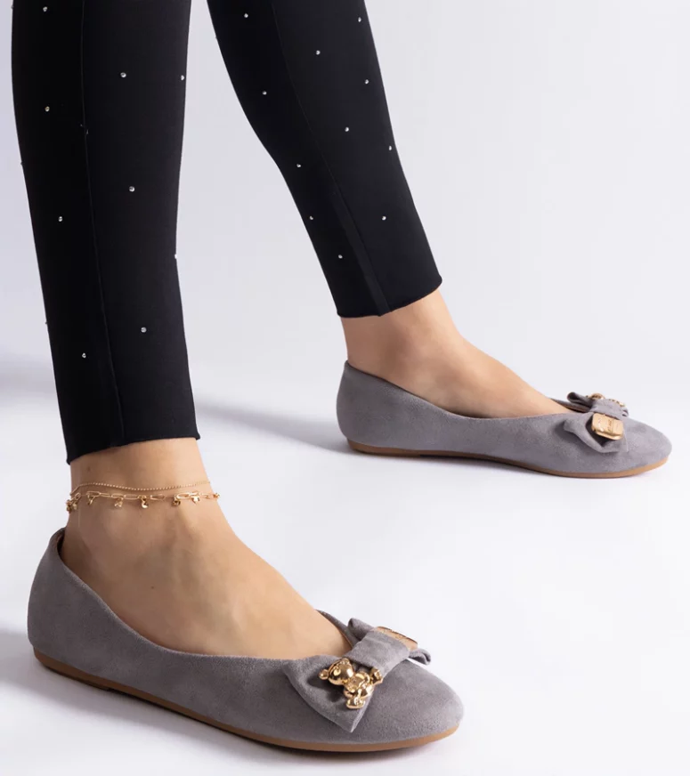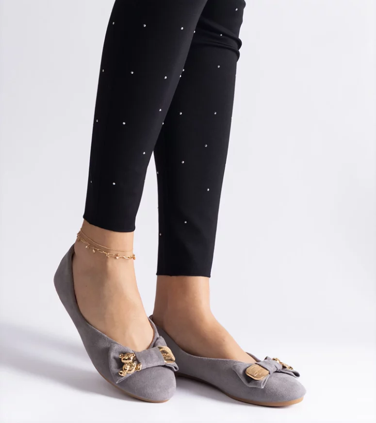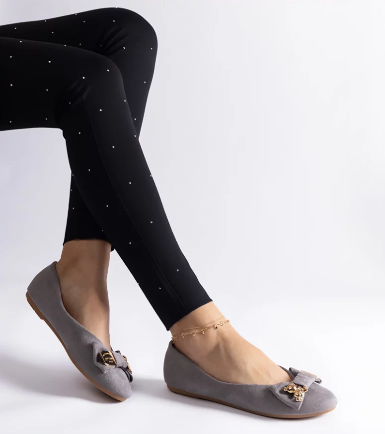 Nasze szare balerinki charakteryzują się subtelnym designem, który idealnie komponuje się z różnorodnymi stylizacjami. Dzięki klasycznej kolorystyce, są one uniwersalnym dodatkiem do garderoby, pasującym zarówno do casualowych, jak i bardziej formalnych zestawień. Zdobione delikatną kokardką i efektowną broszką, dodają uroku każdej stylizacji.