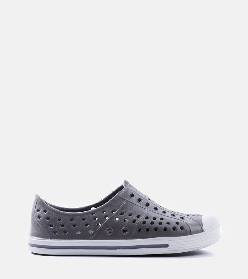 Klapki basenowe dla dzieci Peppin. Zachwycają wygodą użytkowania, ponieważ zostały wykonane z lekkiego i elastycznego tworzywa gumowego. Oprócz tego, łatwemu wsuwaniu, mogą posłużyć jako klasyczne klapki lub jako sandały, tak, by zapewnić dziecku jak największy komfort. Ich dziurkowanie sprawia, że woda nie zatrzymuje się w butach. Idealnie sprawdzą się zarówno na basen, jak i na plażę lub nad jezioro. Wszelkie zabrudzenia możesz łatwo usuwać za pomocą wilgotnej szmatki. Numeracja niestandardowa, prosimy kierować się tabelą rozmiarów.