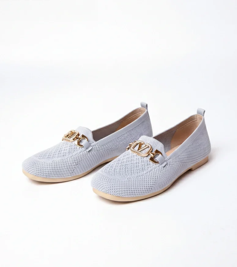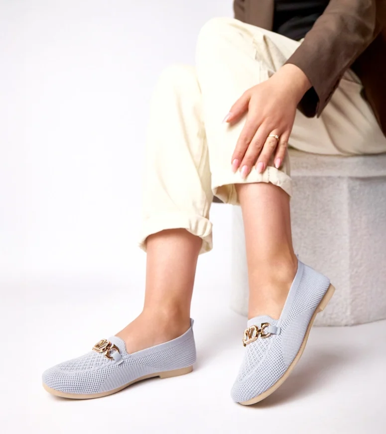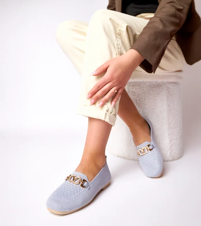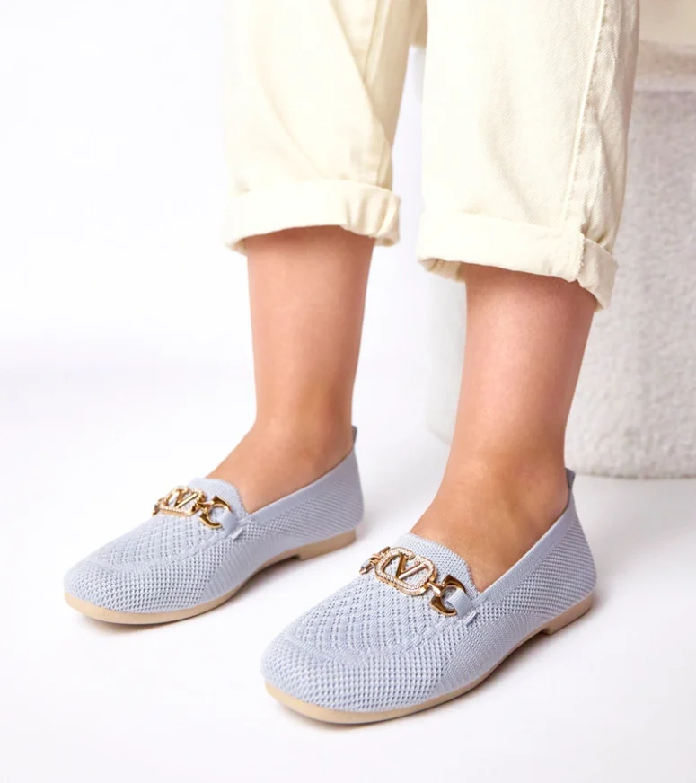 Szare materiałowe mokasyny ze złotą ozdobą Bianca