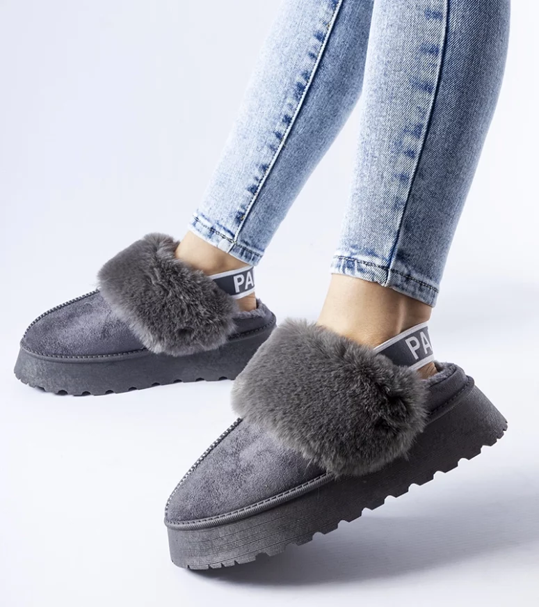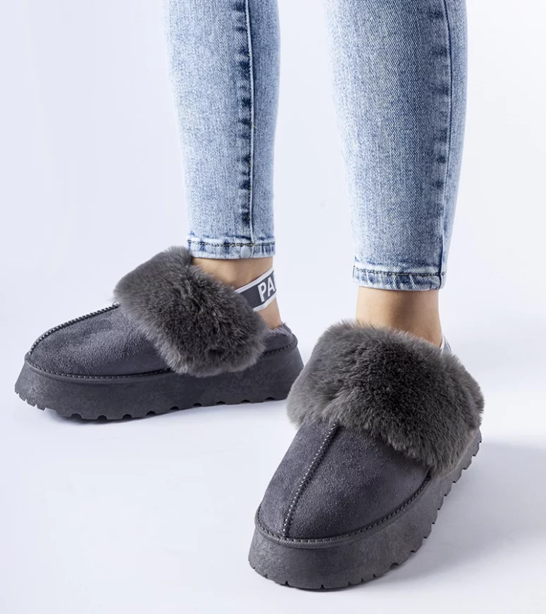 Szare ocieplane kapcie z gumką i futrem Sangro