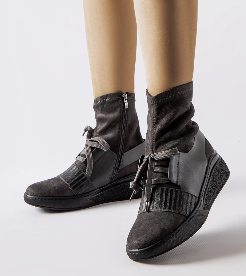 Botki doskonale dopasowują się do stopy, zapewniając komfort noszenia przez cały dzień. Ich wysokość za kostkę dodaje im elegancji i sprawia, że idealnie pasują zarówno do casualowych, jak i bardziej formalnych stylizacji. Buty posiadają średni obcas, który dodaje kobiecego wdzięku, jednocześnie pozostając wygodnym do chodzenia. Dodatkowo, są wsuwane, co ułatwia ich zakładanie i zdejmowanie. Te szare skarpetkowe botki na koturnie Spoleto to połączenie stylu, wygody i oryginalności. Idealne dla kobiet, które chcą być trendy, ale nie rezygnują z komfortu.