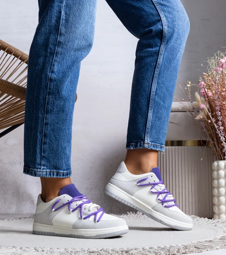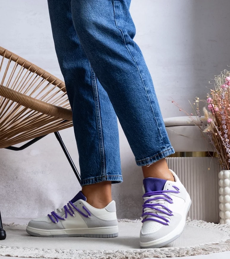Zapraszamy do zakupów w naszym sklepie internetowym, gdzie znajdziesz szeroki wybór obuwia sportowego i nie tylko. Nasze szare sneakersy z fioletowymi sznurówkami czekają właśnie na Ciebie!