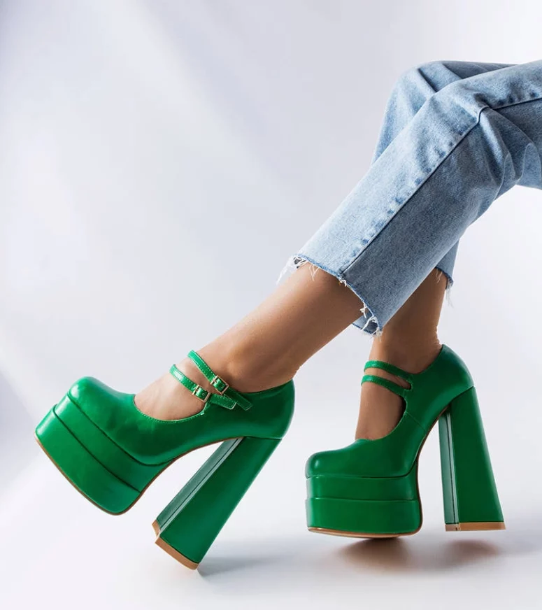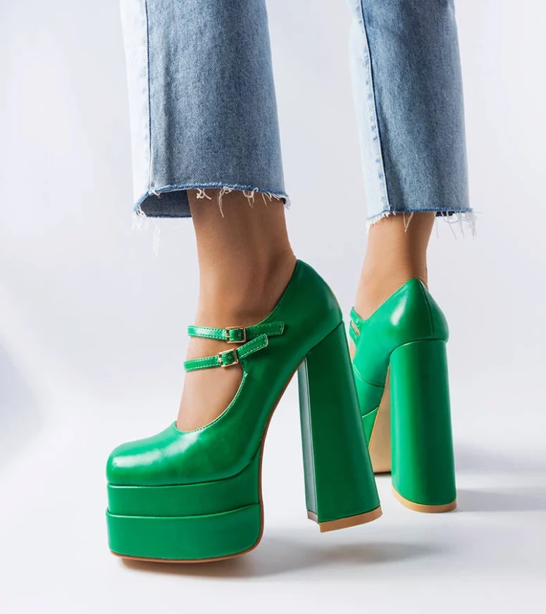 Czółenka Chouinard na wysokim, powlekanym słupku i dodatkowej platformie. Kwadratowe zaokrąglone noski. Zapinane na cienkie paski z małymi sprzączkami. Wykonane ze skóry ekologicznej. Całość w jednolitej kolorystyce. To model, który doskonale wydłuży nogi. Numeracja standardowa, prosimy sugerować się swoim rozmiarem.