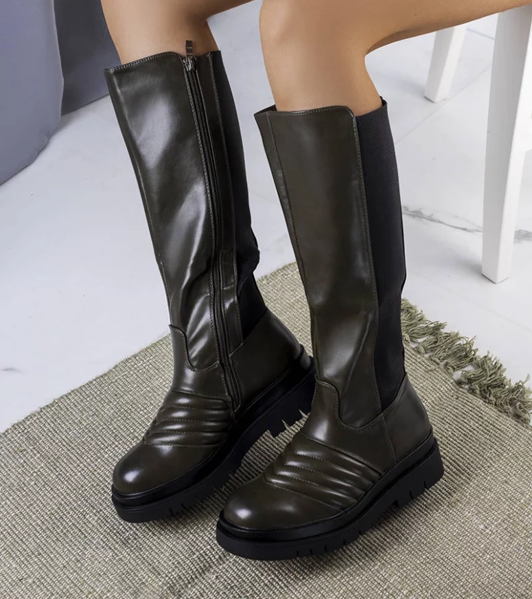 Kozaki Calliope wykonane z gładkiej ekoskóry, zdobionej delikatnymi przeszyciami. Po wewnętrznej stronie cholewki wygodne zapięcie na zamek błyskawiczny. Osadzone na płaskim obcasie oraz grubej podeszwie ze stylowymi żłobieniami. Dodatkowo po zewnętrznej stronie elastyczna wstawka. Środek lekko ocieplany kocem obuwniczym. Kozaki Calliope zostały stworzone z myślą o kobietach ceniących elegancki i ponadczasowy styl! Numeracja standardowa. prosimy kierować się swoim rozmiarem.