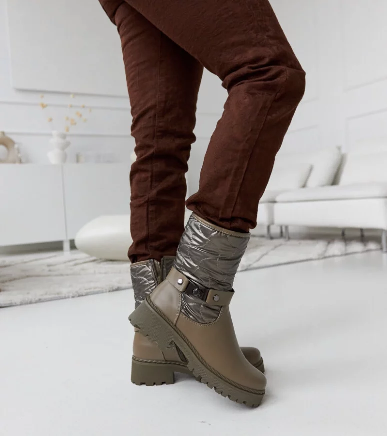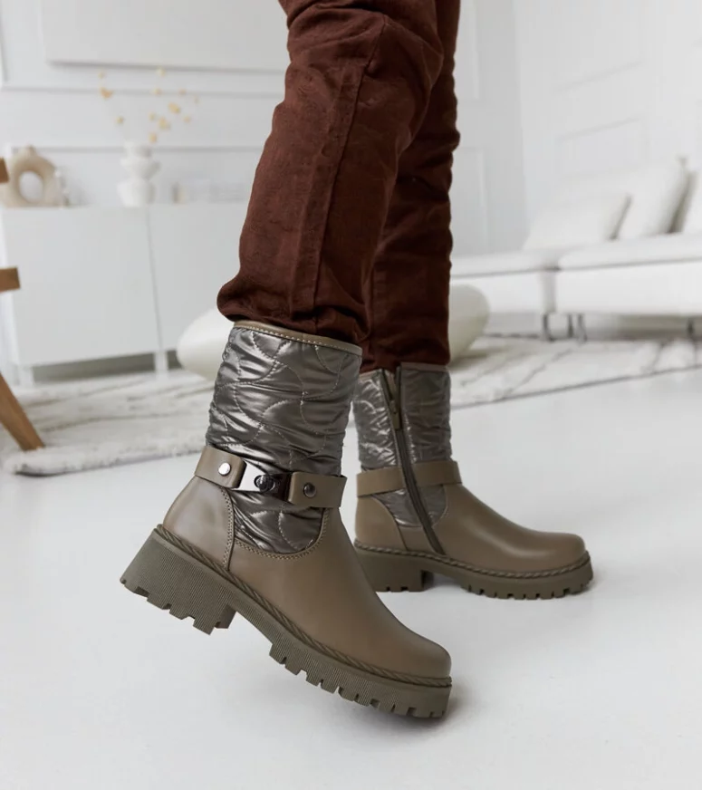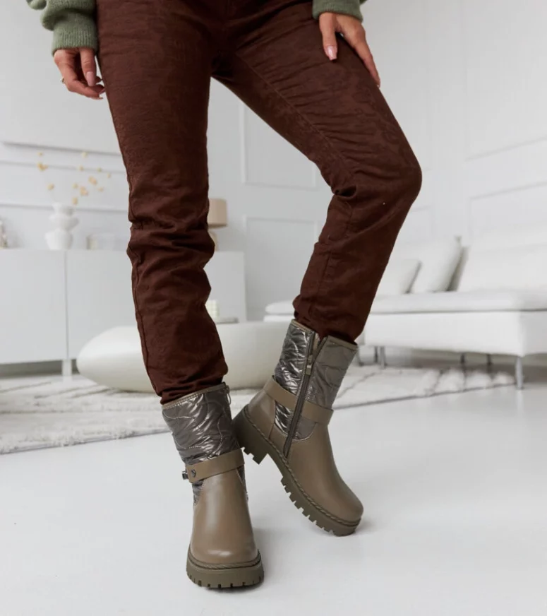 Dzięki ocieplanej konstrukcji, te botki są niezwykle ciepłe i doskonale chronią przed niskimi temperaturami. Ich wysokość za kostkę sprawia, że nadają się zarówno do codziennych stylizacji, jak i bardziej eleganckich okazji. Botki wykonane są w nowoczesnym i stylowym designie, który dodaje im charakteru. Ozdobny pasek nadaje im oryginalności i sprawia, że są one wyjątkowe. Unikalność tych botków polega również na ich płaskim obcasie, co czyni je bardzo wygodnymi do noszenia przez dłuższy czas. Dodatkowo, zamek umieszczony po boku ułatwia zakładanie i zdejmowanie butów. Innowacyjność tego modelu przejawia się także w materiałach użytych do produkcji. Zostały one wykonane z wysokiej jakości gumy, która gwarantuje trwałość i odporność na wilgoć. Dzięki temu możesz być pewien, że Twoje stopy będą suche nawet podczas deszczowej pogody. Te zimowe botki są nie tylko modne, ale także praktyczne. Dzięki nim będziesz cieszyć się komfortem i stylowym wyglądem przez całą zimę.