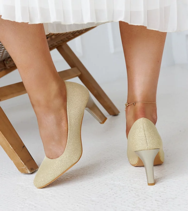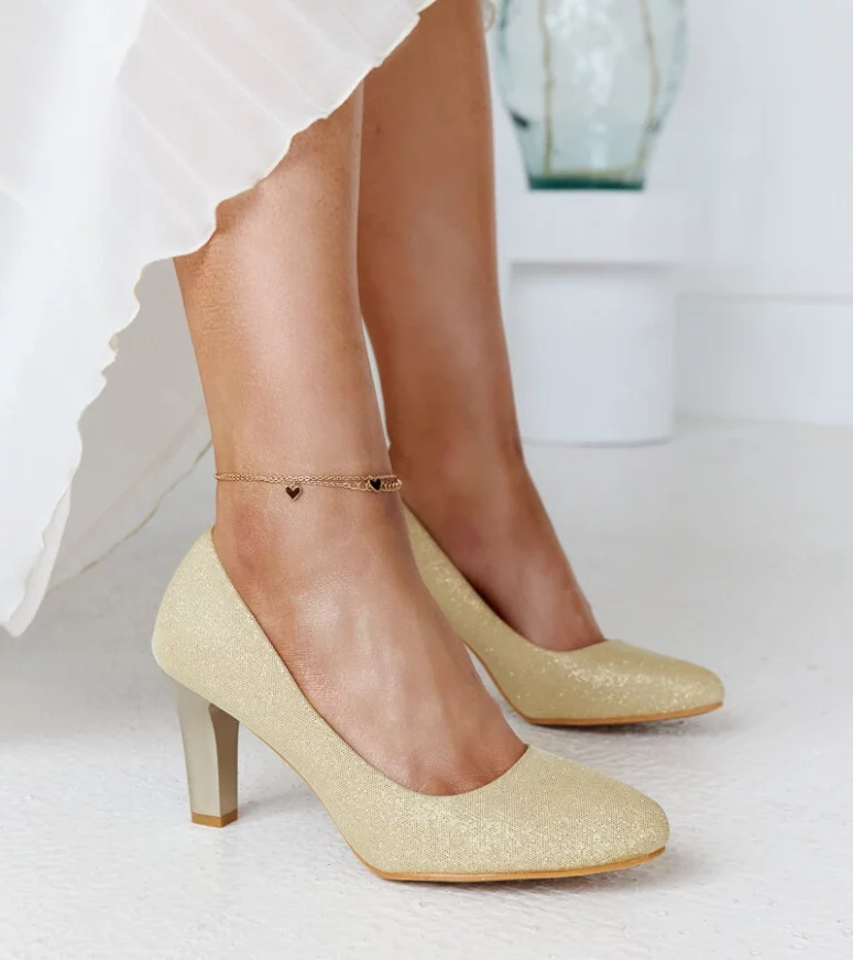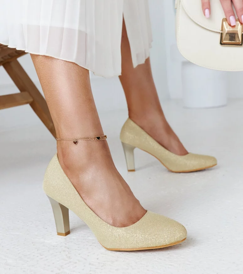 Złote błyszczące czółenka ze skórzaną wkładką Antibies