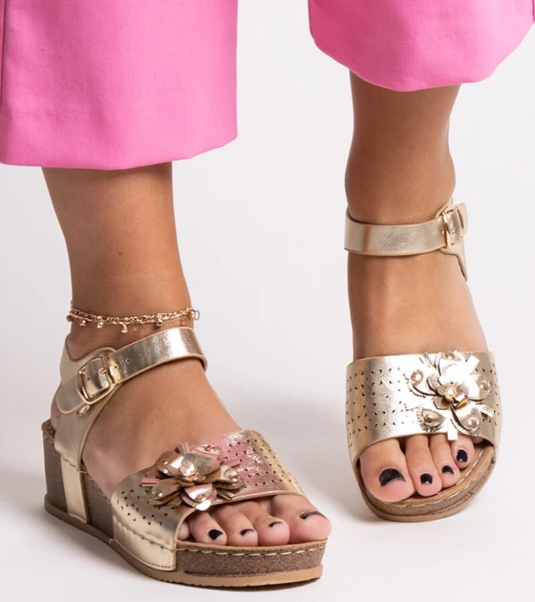 Złote sandały na koturnie z kwiatem Kifah to idealne obuwie na gorące letnie dni. Ich postępowy design sprawia, że są niezwykle modernistyczne i stylowe. Wykonane z metalicznego tworzywa sztucznego, posiadają wygodny koturn na średnim obcasie. Dodatkowo ozdobione są pięknym kwiatem oraz sprzączką, co nadaje im unikalny charakter. Te sandały będą doskonałym uzupełnieniem letniej garderoby dla każdej kobiety, która ceni sobie oryginalność i komfort.