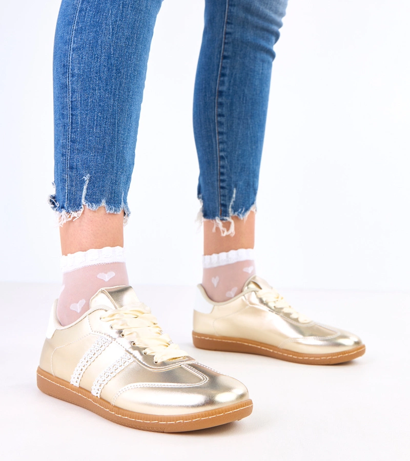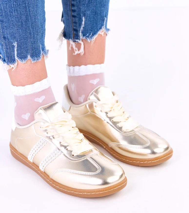 Dzięki zaawansowanej technologii produkcji, te złote sneakersy zapewniają doskonałe dopasowanie do stopy, co zwiększa komfort noszenia nawet przez cały dzień. Antypoślizgowa podeszwa gwarantuje bezpieczeństwo na każdej nawierzchni, co czyni je idealnym wyborem na każdą pogodę.