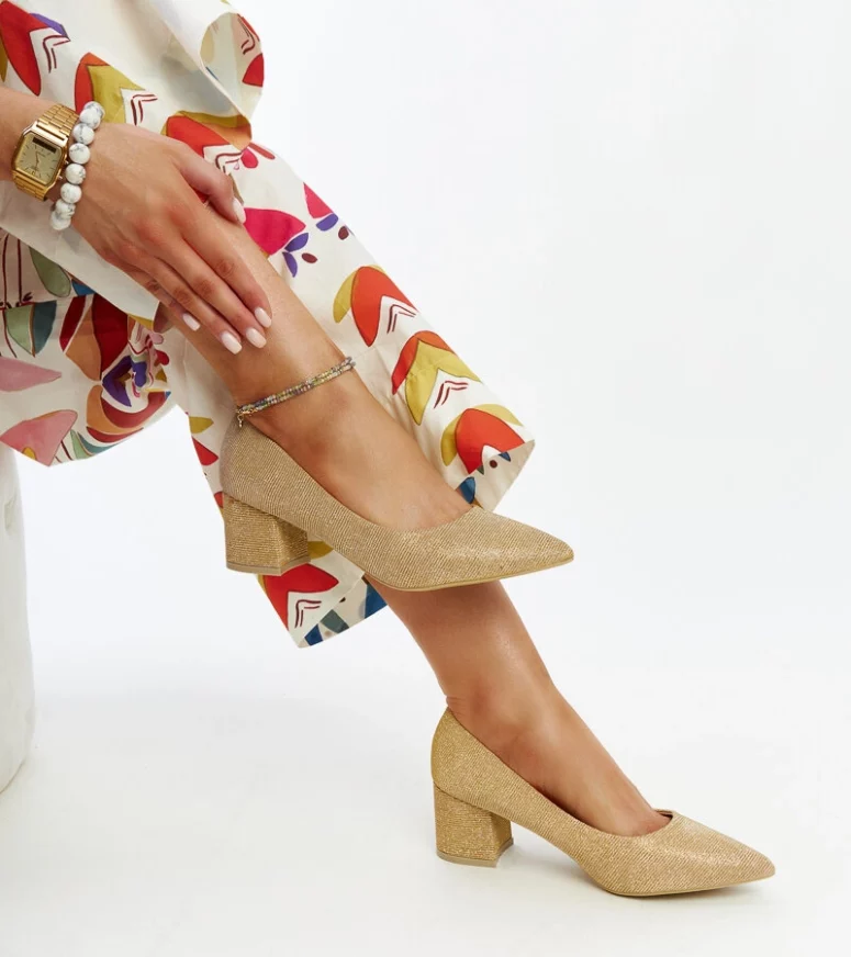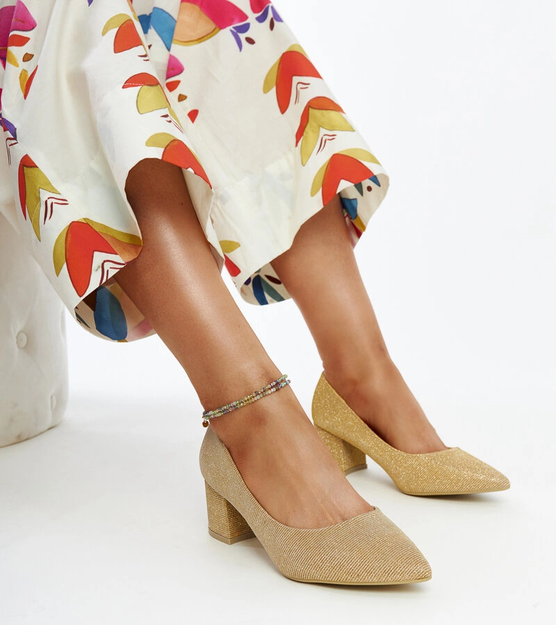 Złote świecące czółenka na słupku Laity to idealna propozycja dla każdej kobiety, która uwielbia błyszczeć! Wykonane z wysokiej jakości tworzywa sztucznego, te wyjątkowe buty posiadają średni obcas oraz modny krój ze szpicowatym nosem. Dzięki wsuwanej konstrukcji są niezwykle wygodne w noszeniu, a ich metaliczny blask przyciąga wzrok. Dodatkowo, ozdobione subtelnie połyskującymi detalami na szpilce sprawiają, że prezentują się niezwykle elegancko i stylowo. Te złote czółenka na pewno dodadzą Ci klasy i szyku, sprawiając, że będziesz się w nich czuła jak prawdziwa królowa mody!