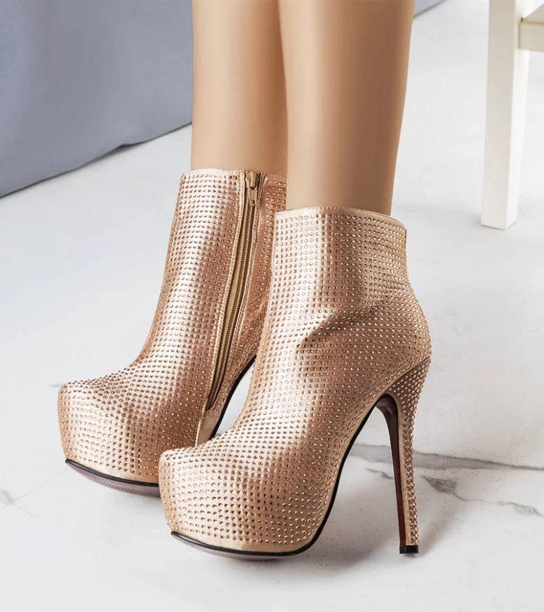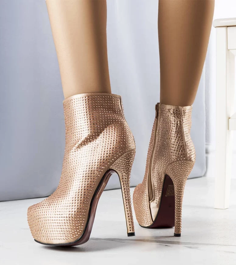 Botki na wysokiej szpilce Tatiana ze szpiczastym noskiem. Zapinane na zamek, wykonane z tkaniny zdobionej cyrkoniami w dopasowanym kolorze. Obuwie jest lekko ocieplane. Leżą dobrze na wąskiej stopie. Koniecznie zestaw je z koktajlową sukienką i kopertówką. Numeracja zaniżona, sugerujemy wybrać o rozmiar większe.