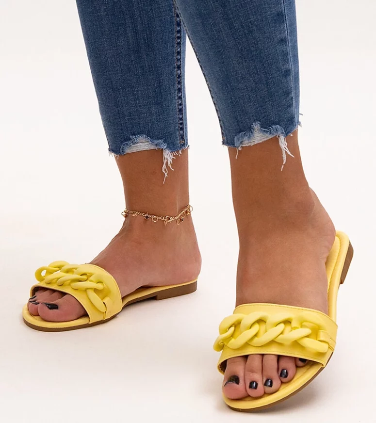 Te żółte klapki z matowym łańcuchem Aliyan są absolutnym sztos na nadchodzący sezon letni! Wykonane z wytrzymałej gumy, są nie tylko stylowe, ale także bardzo wygodne. Ich wsuwany design sprawia, że są popularnym must-have w garderobie każdej fashionistki.