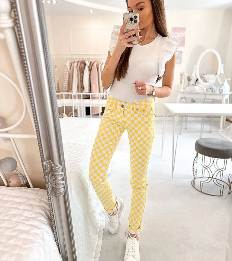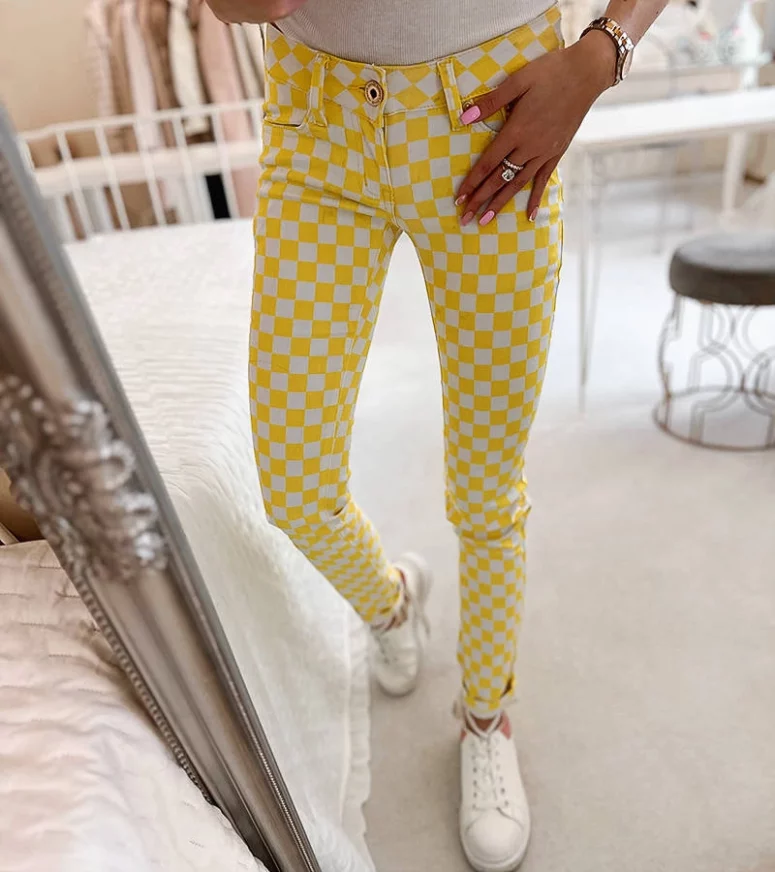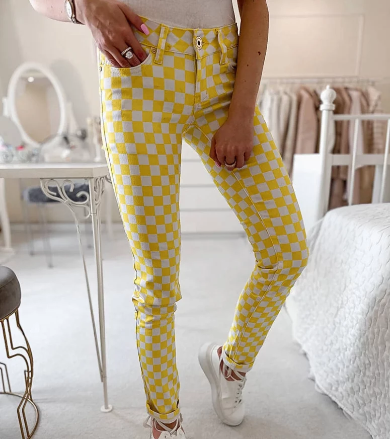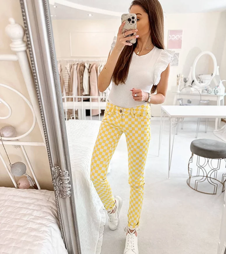 Żółte spodnie materiałowe w kratę Bler