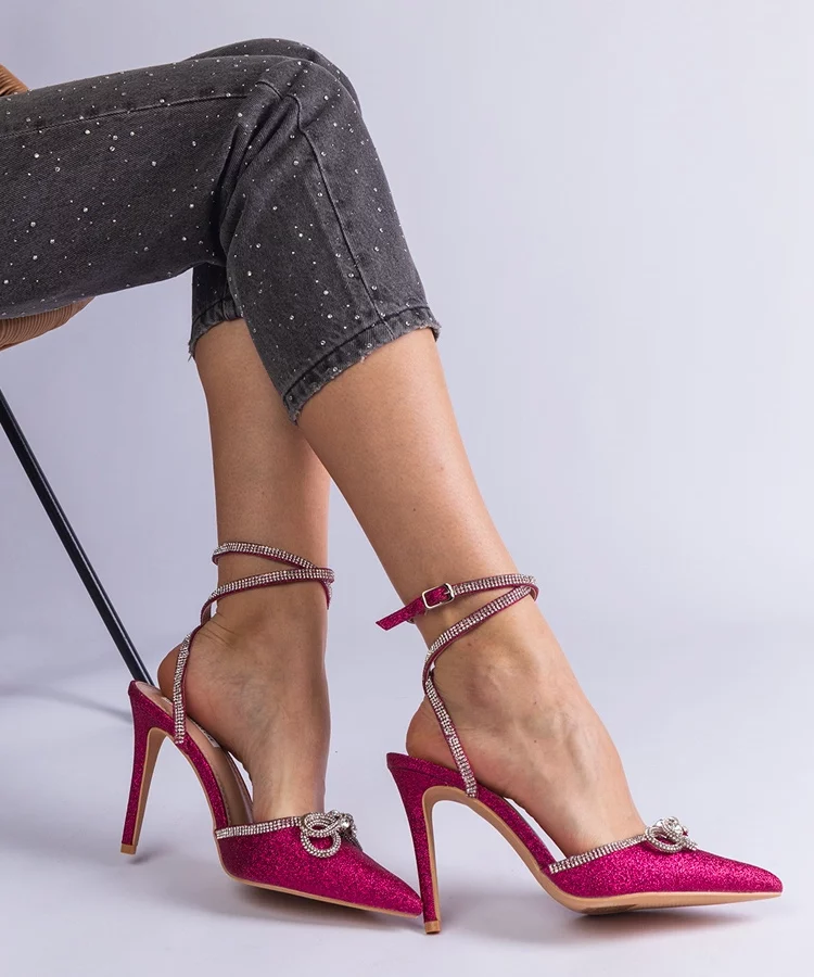 Różowe szpilki brokatowe z kokardką i cyrkoniami Merkuri